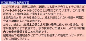 「パークホームズ錦糸町北斎通り」がある「東京都墨田区亀沢4丁目」は、浸水の懸念があります。リスクヘッジするなら3階以上を選びたいです。
