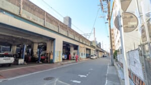 (南)高架下に自動車整備所があり、まだ住宅街でありながらも、純粋な住宅街より少しだけガヤっとする印象です。