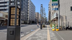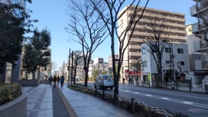 北斎通りのマンションがある位置から西側・両国駅にかけては個性的な飲食店も点在。歩道には少し「和」を感じさせる街路灯が並んでいて、落ち着きのある街並みです。