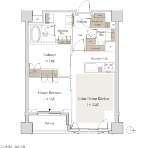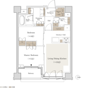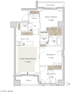 - Bedroom(1)が折りたためるウォールドアなので、今はリビングを広々使いたいけれど、必要になったら3LDKにしたい、という人に向いています。