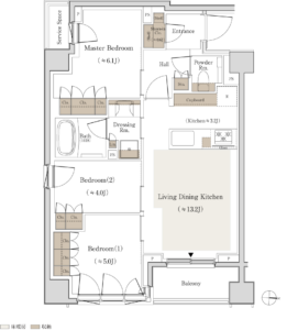 - 総面積は3LDKにしては少なめですが、廊下がとても短いので各部屋の面積は意外と確保できています。
