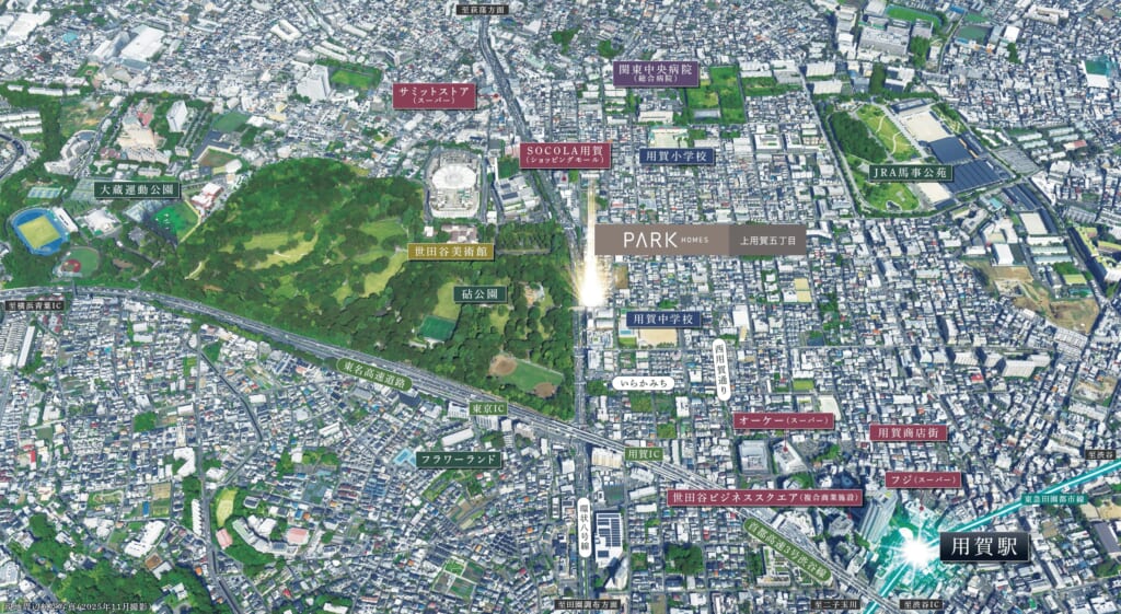 「パークホームズ上用賀五丁目」39万平米超の砧公園フロント立地、東急田園都市線「用賀」駅から「渋谷」駅へ直通14分。
