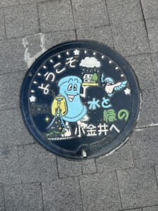 ▼駅のロータリーに、小金井市の公共下水道キャラクター「桜水(おうすい)くん」デザインのマンホールを発見しました。駅周辺の5か所限定で設置されていますので、ぜひ探してみてください^_^