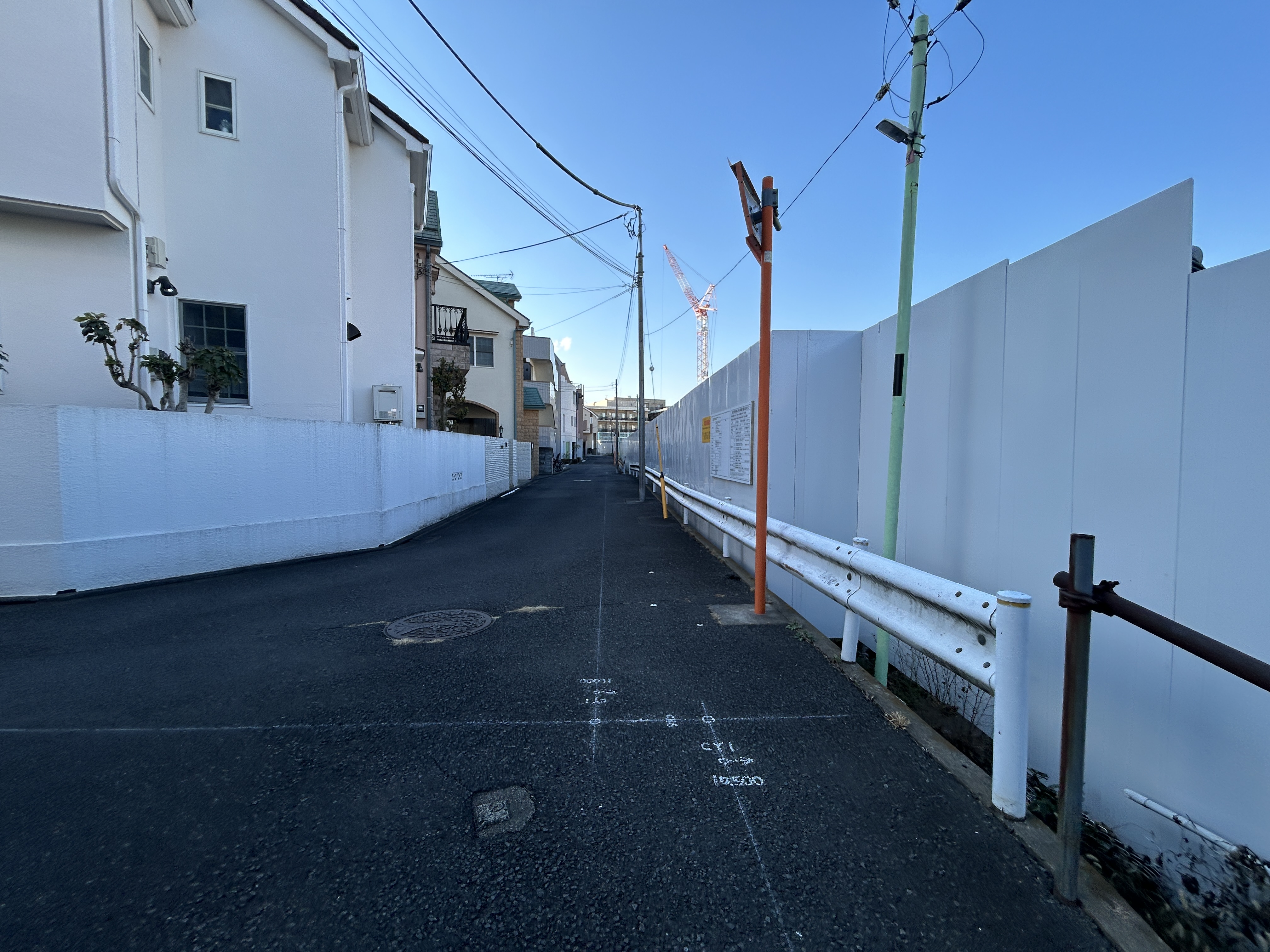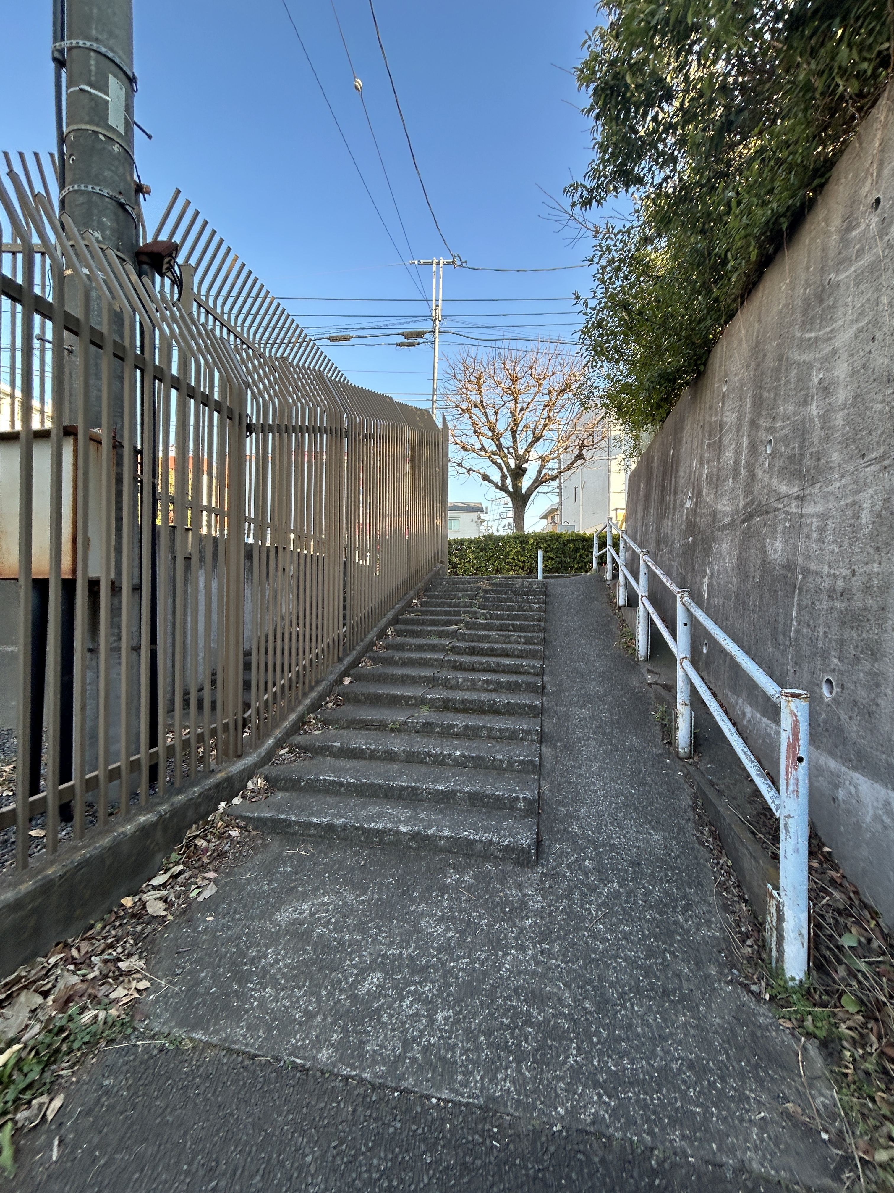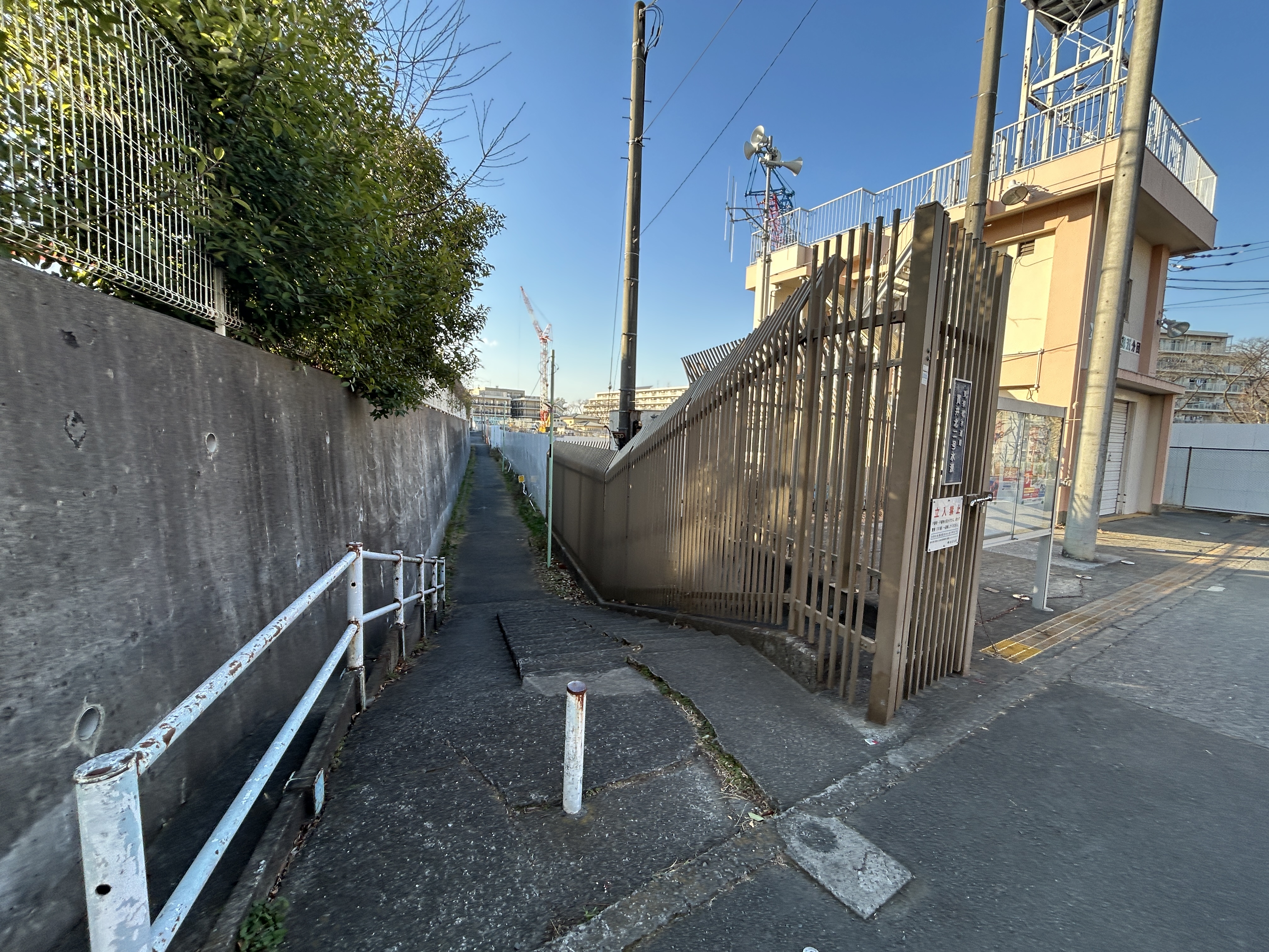 ▼南側には細い道路があります。車両は通行することはできません。高低差があり、階段とスロープが設置されています。道路を挟んで南側(写真左手)の方が地盤が高くなっていますね。