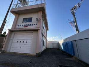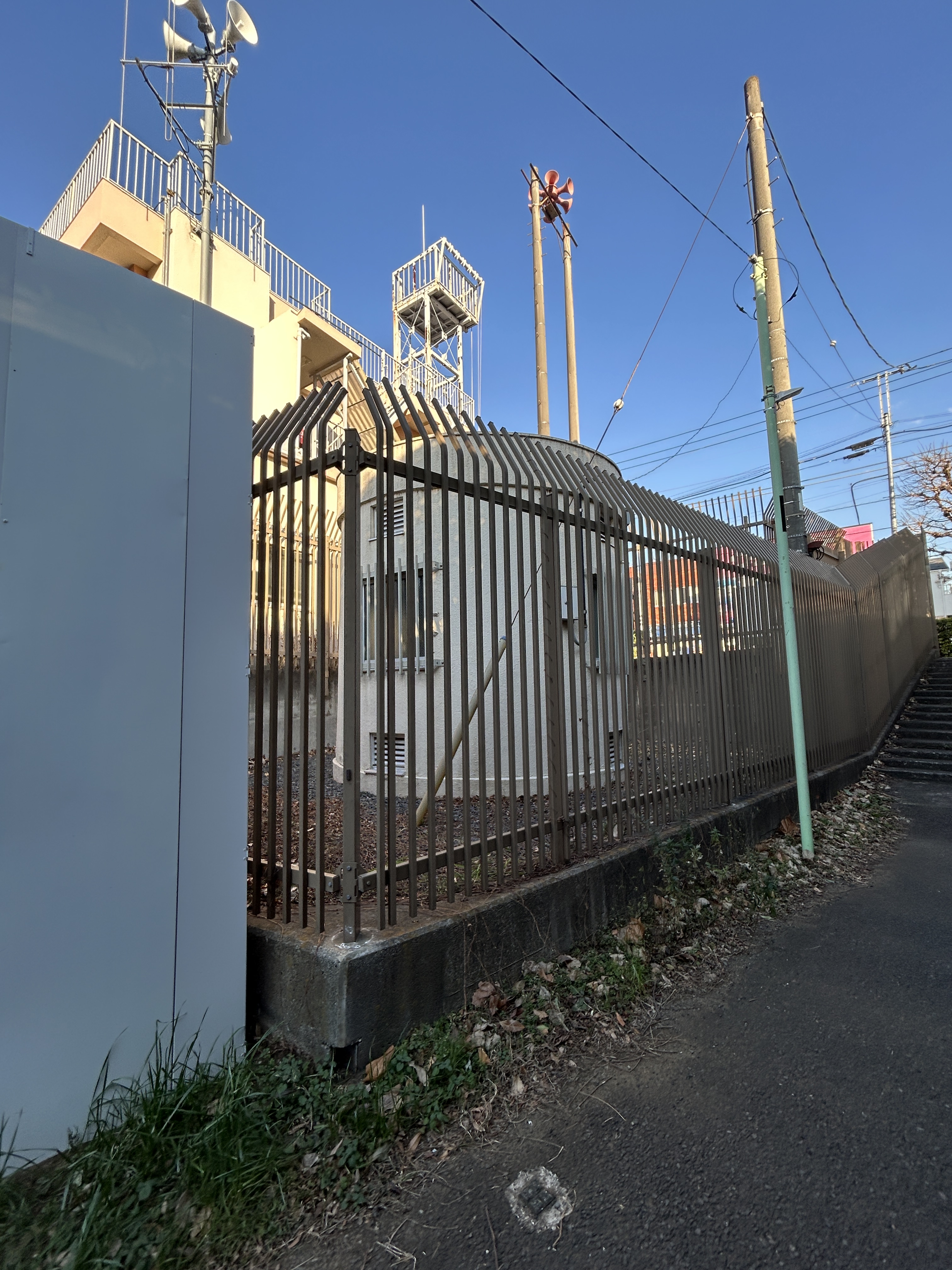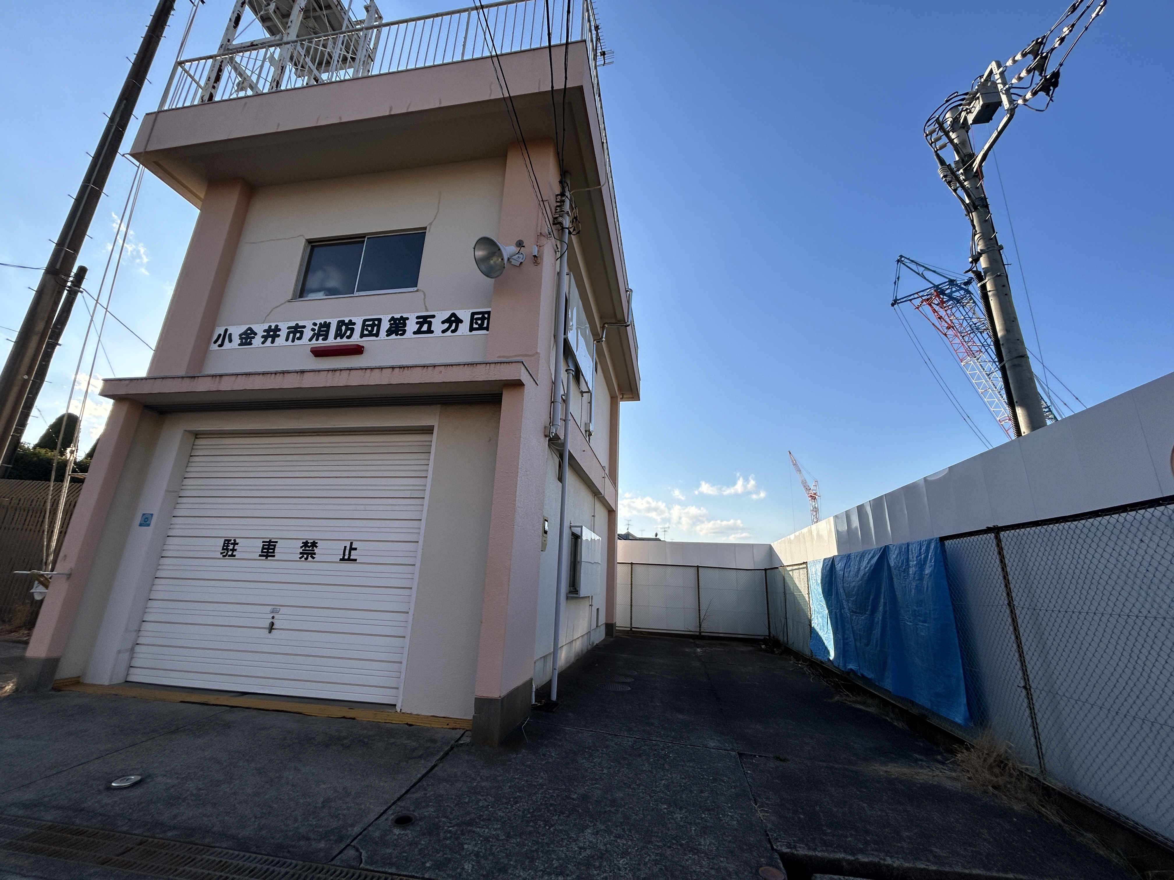 ▼南東角には小金井市消防団の詰所があります。担当地区内における有事の際はここから消防ポンプ車で出動します。1月を除き、毎月1日の午前8時には、火災予防呼びかけのためサイレンが鳴ります。