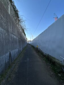▼南側の細い道路を進みます。南側隣地(写真左手)との高低差が大きいですね!