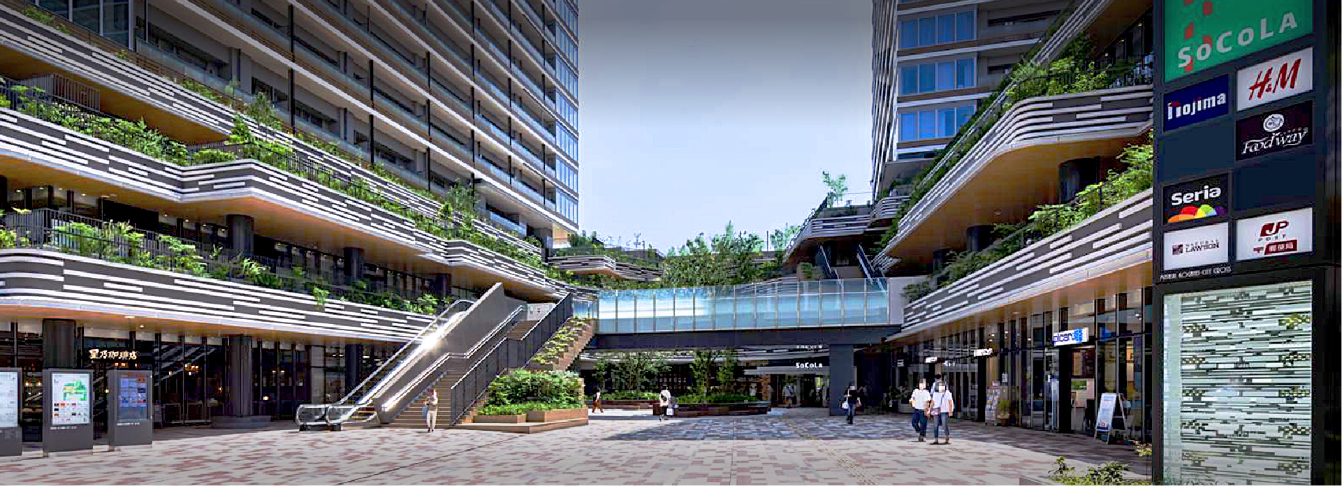 1階〜4階はSOCOLAという複合商業施設が入っており、商業部分の緑あふれる外観も素敵ですね。