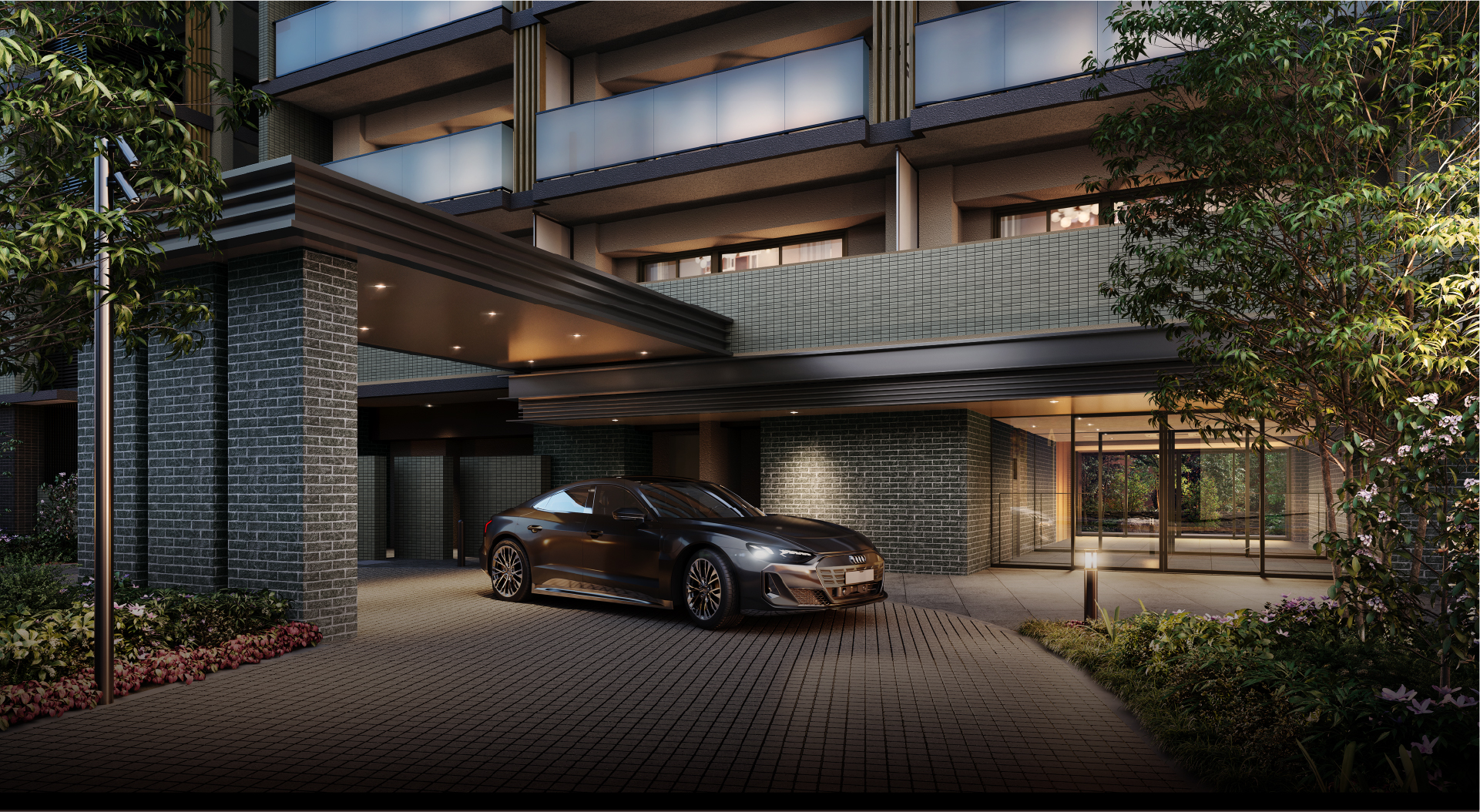 メインエントランスにはダイナミックな庇が付いた半円状の車寄せがあります。高級感のある車寄せで格好良いですね~!共用部