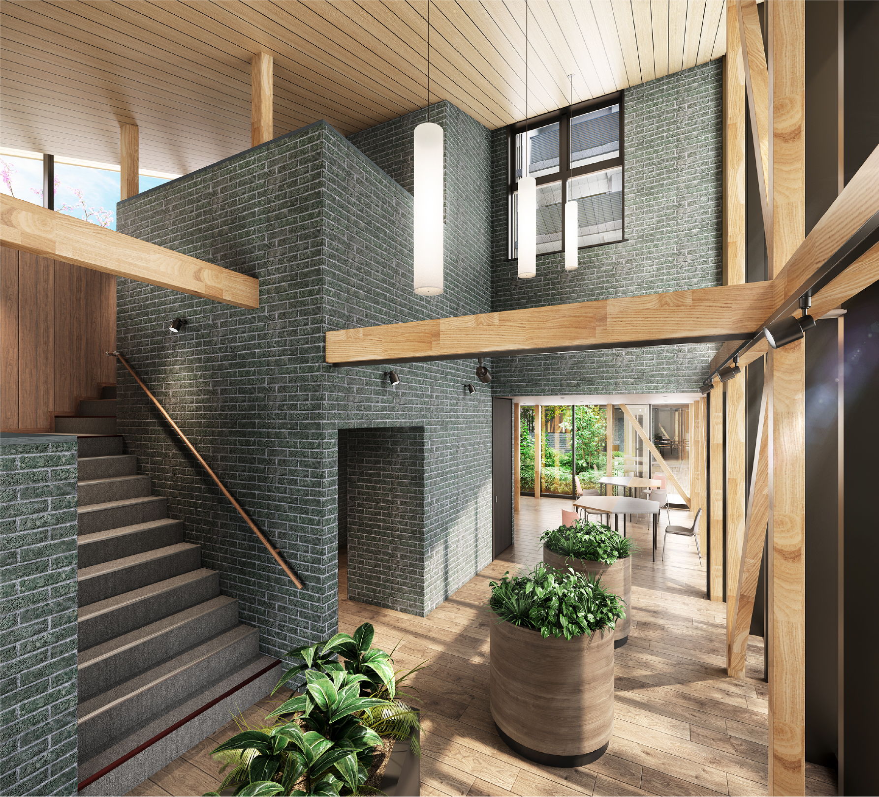 住箱のような閉ざされた空間の共用部もあれば、開かれた共用部もちゃんとあっていいですね。居住者同士が繋がる場になるよう、木のぬくもりをいっぱいに感じさせる空間に設計されています!