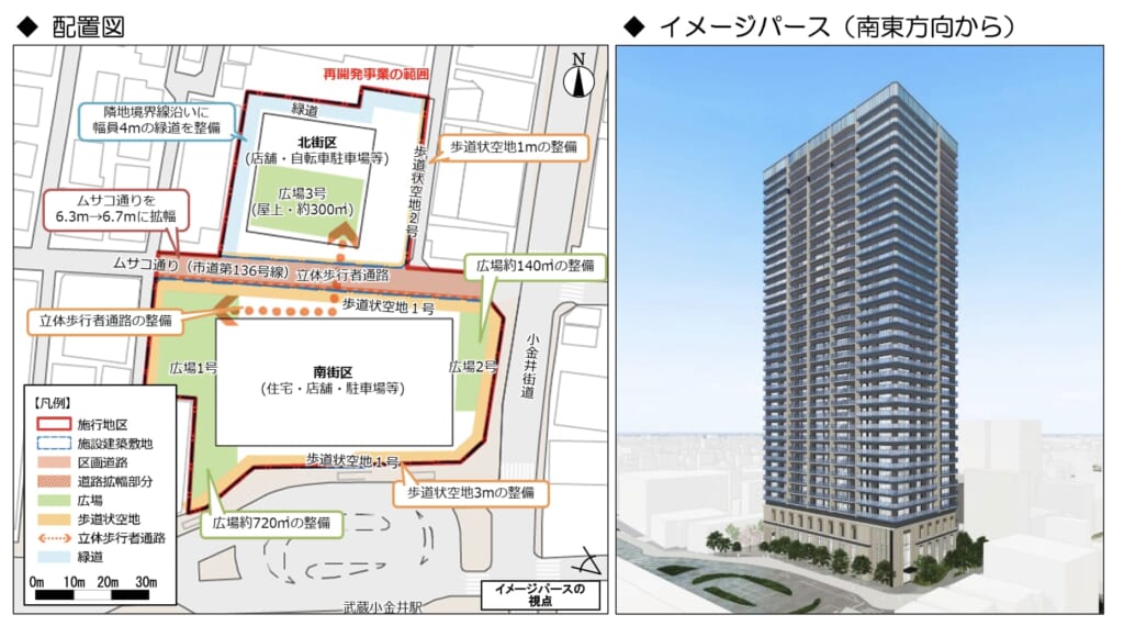 現地へ行く前に、武蔵小金井駅北口の駅前再開発について触れておきましょう。今回再開発される場所は駅北口のロータリー前です。店舗・住宅・駐車場・駐輪場が新たに誕生予定であり、住宅に関しては地上35階415戸のタワーマンションです。