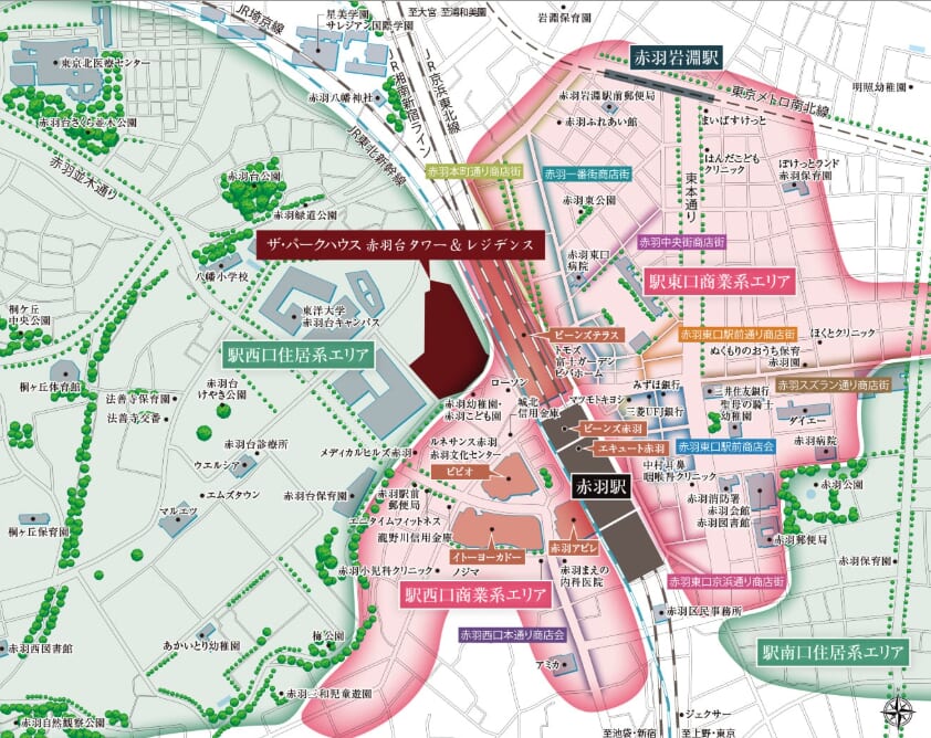 どちらも基本的に生活利便性としては不便はあまりありませんが、飲み屋街から外れて落ち着いて過ごすことや日常的な買い物で便利なビビオやイトーヨーカドーがある点では、西口側のザ・パークハウス 赤羽台タワー&レジデンスが魅力的と考えられます。