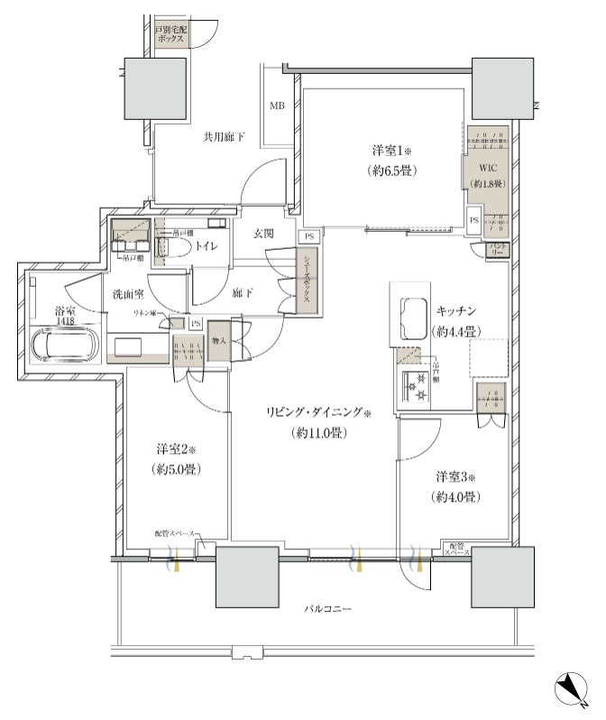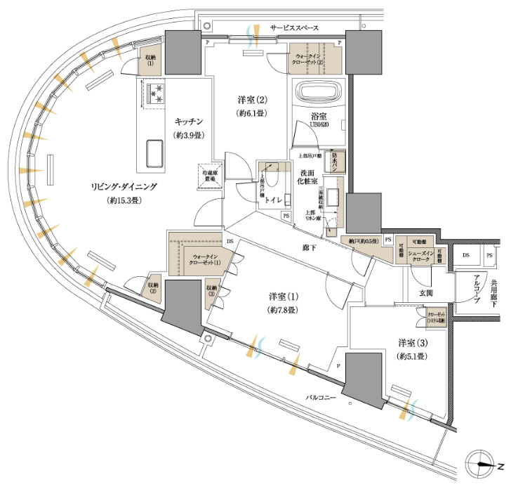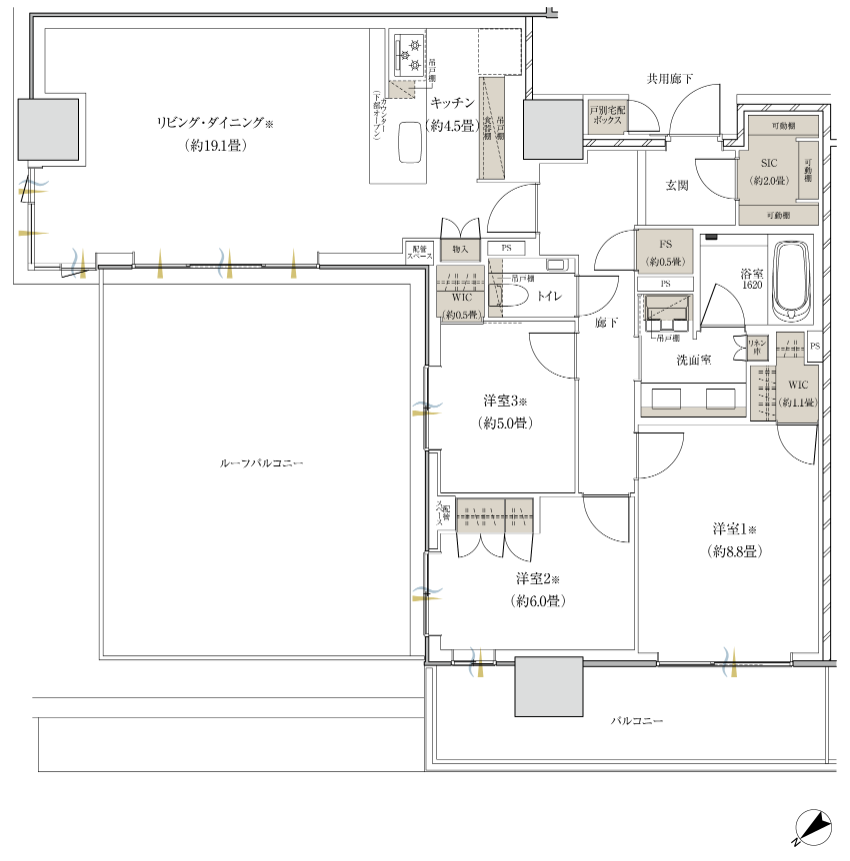 専有部の間取りはどのお部屋もワイドスパンとのことで、洋室の窓面も比較的大きく、リビング・ダイニング以外の洋室も景色が開放的になりやすい作りです。収納面はほんのちょっと物足りなさを感じてしまいます。(実際に完成したらあまり気にならない可能性もあります。)