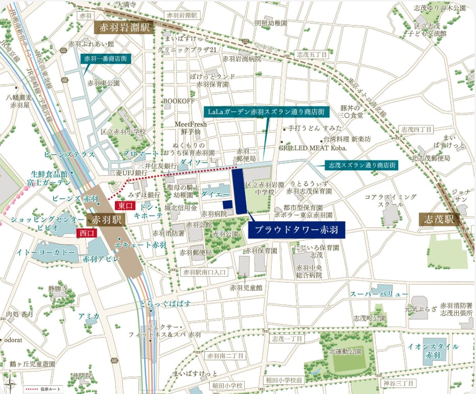 一方、賑やかな飲食店が多く、また商店街や銀行、郵便局が近く、加えて小中学校や公園も近い点では東側にあるプラウドタワー赤羽と考えられます。