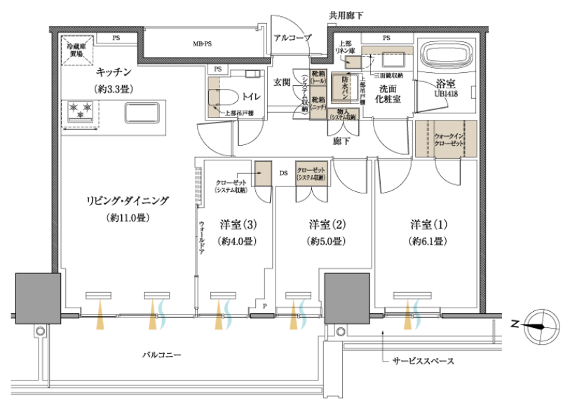 専有部の間取りは、どのプランも戸別宅配ボックスが設置されており、個人的にはかなり便利だと感じます。図面からは全体的に収納面も余裕があるように見えます。食器棚はプレミアムプラン以上でないと標準設置されませんが、プレミアムでなくともオプションで取り付けたいところです。プレミアムプランでは、ルーフバルコニーがあるのは気になります。予算的には手を出せそうにありませんが、いつかルーフバルコニー付の部屋に住んでみたいです。なお、角部屋を除く3LDKの間取りはリビング・ダイニングの窓が2面だけである点は個人的に物足りなさを感じます。