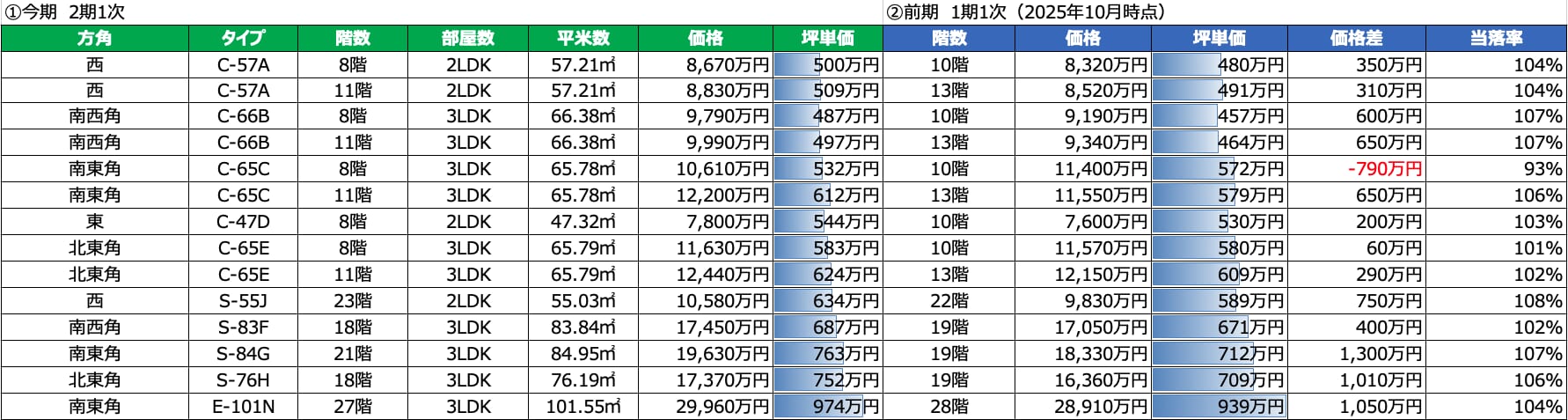 緑色の左側が今期販売、青色の右側が前期の1期販売となりますが、階数が下の階数になっても値段が上がっているので、最近はどの新築タワマンでも階数が下がって値上げするのは当たり前になってきましたね。