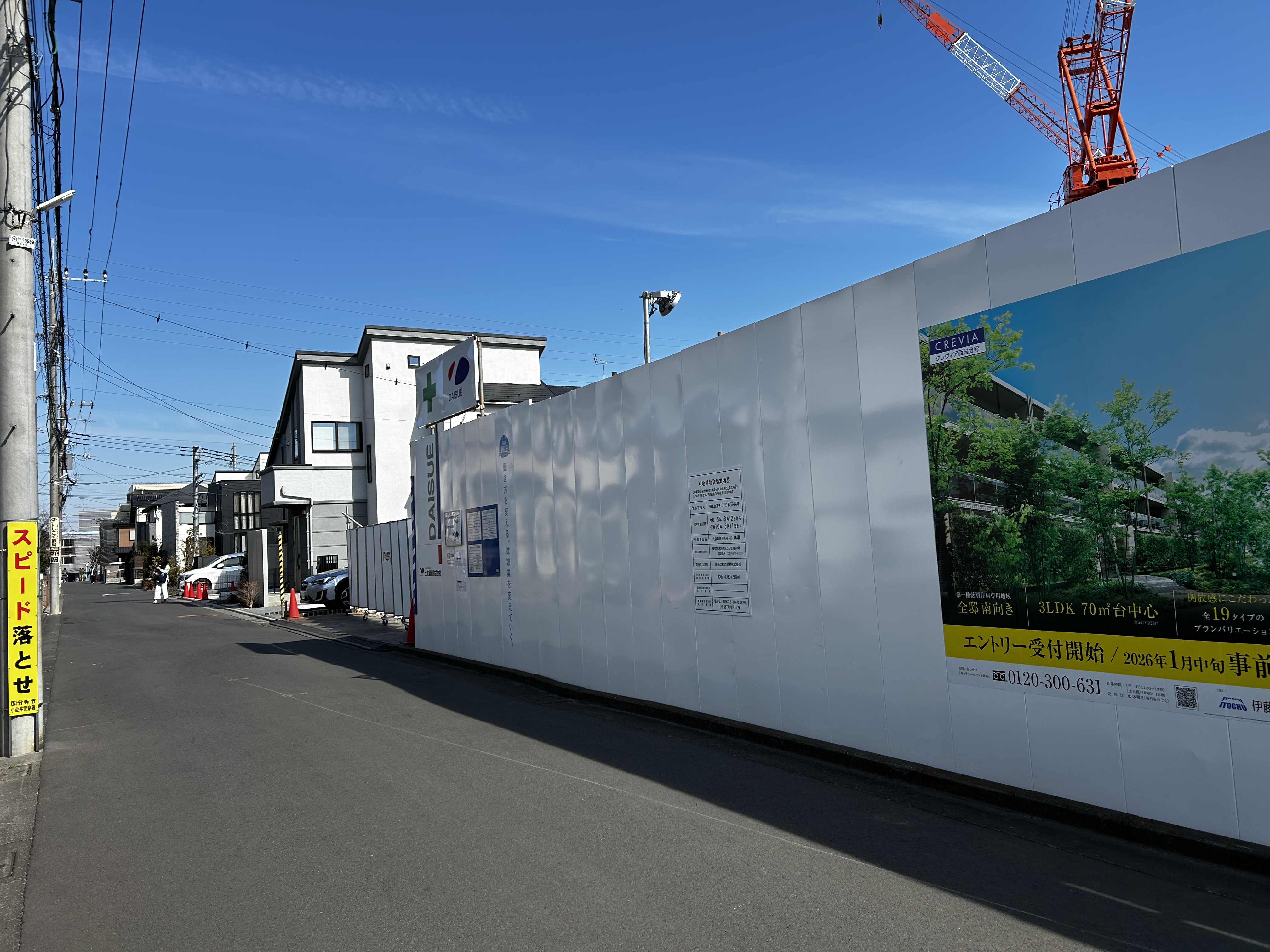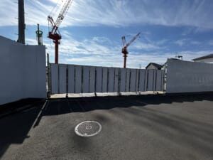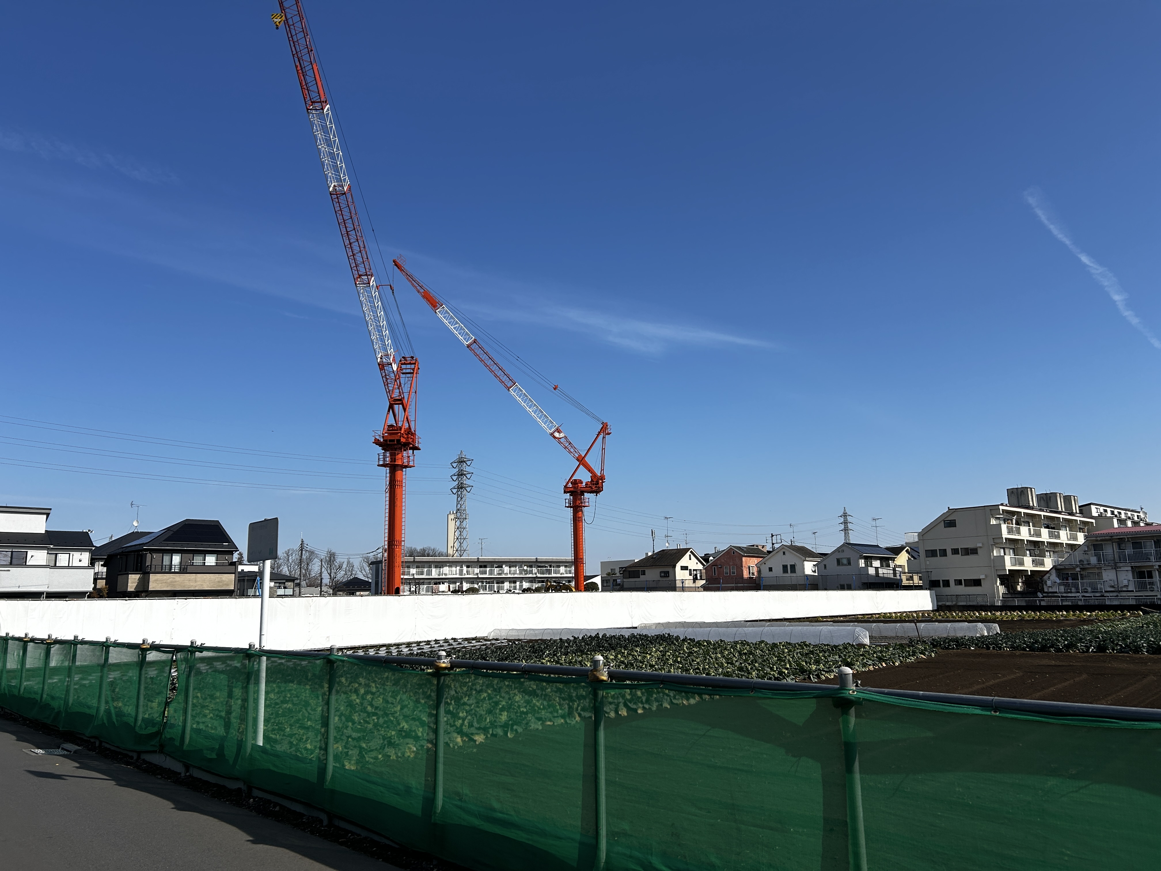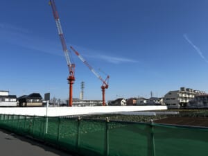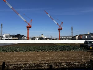 ▼周辺は農地や住宅街になっており、非常にのどかで静かです。その中で現地は巨大なクレーンが2台もあるため、遠くからでもすぐにわかりますよ。