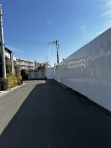 ▼さらに進むと本件の敷地が見えてきました。自転車出入口と車両出入口がつくられます。道幅については車1台は余裕を持って通ることができ、車通りも少ないため、車両の出入りがしやすい道路ですね。