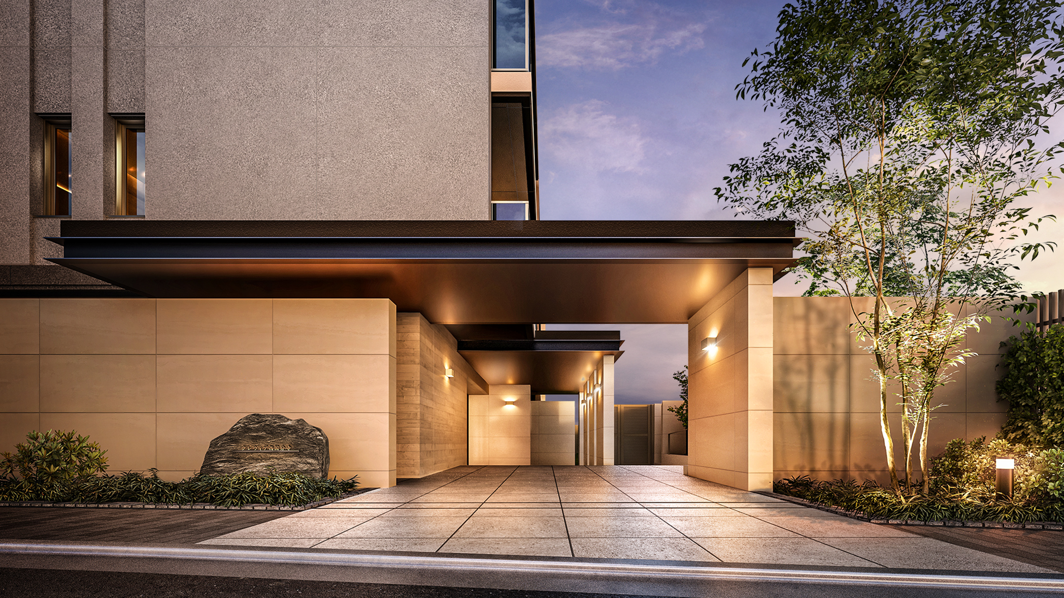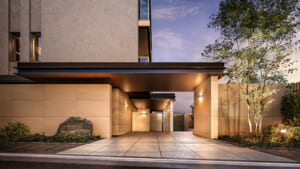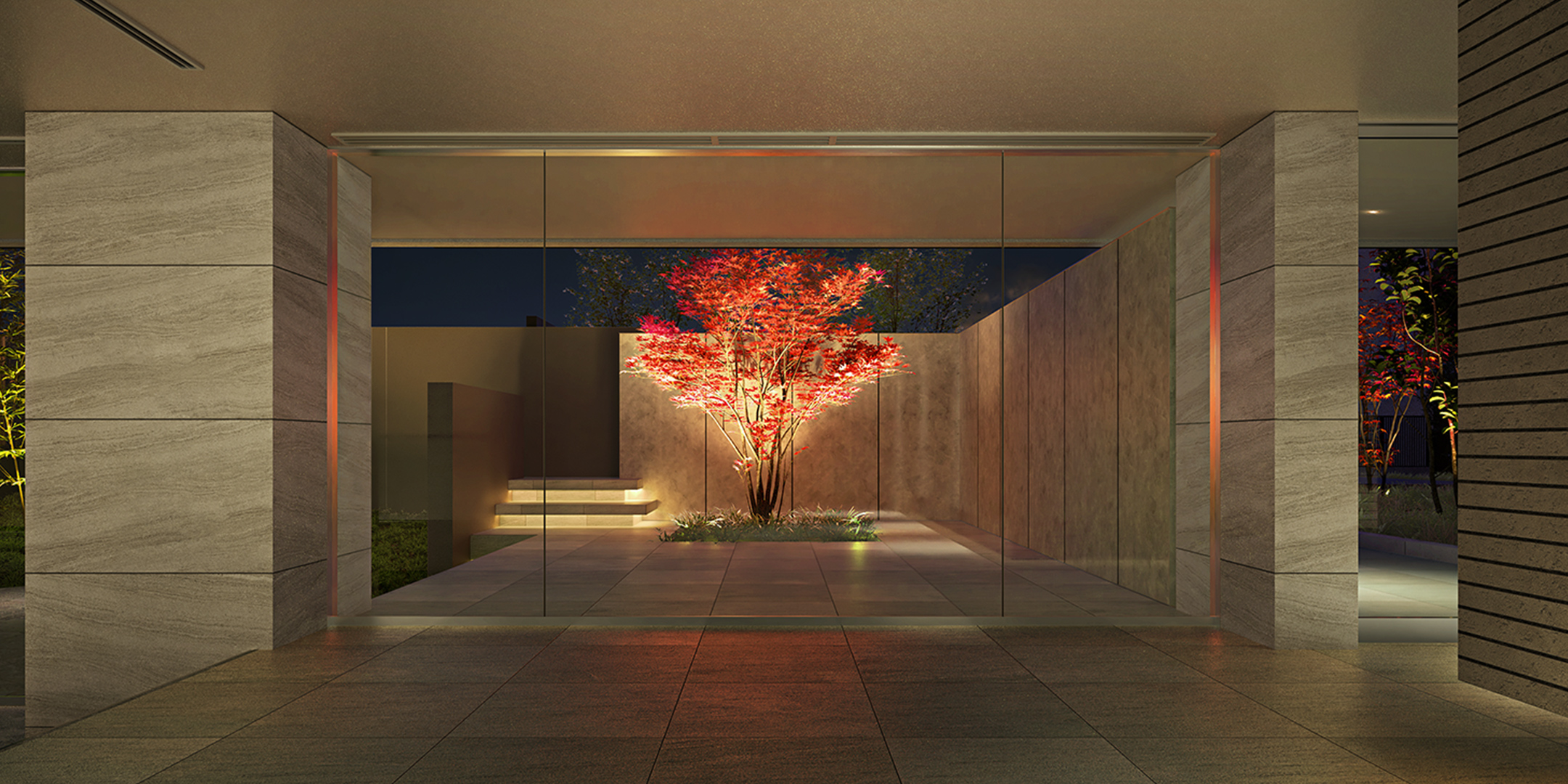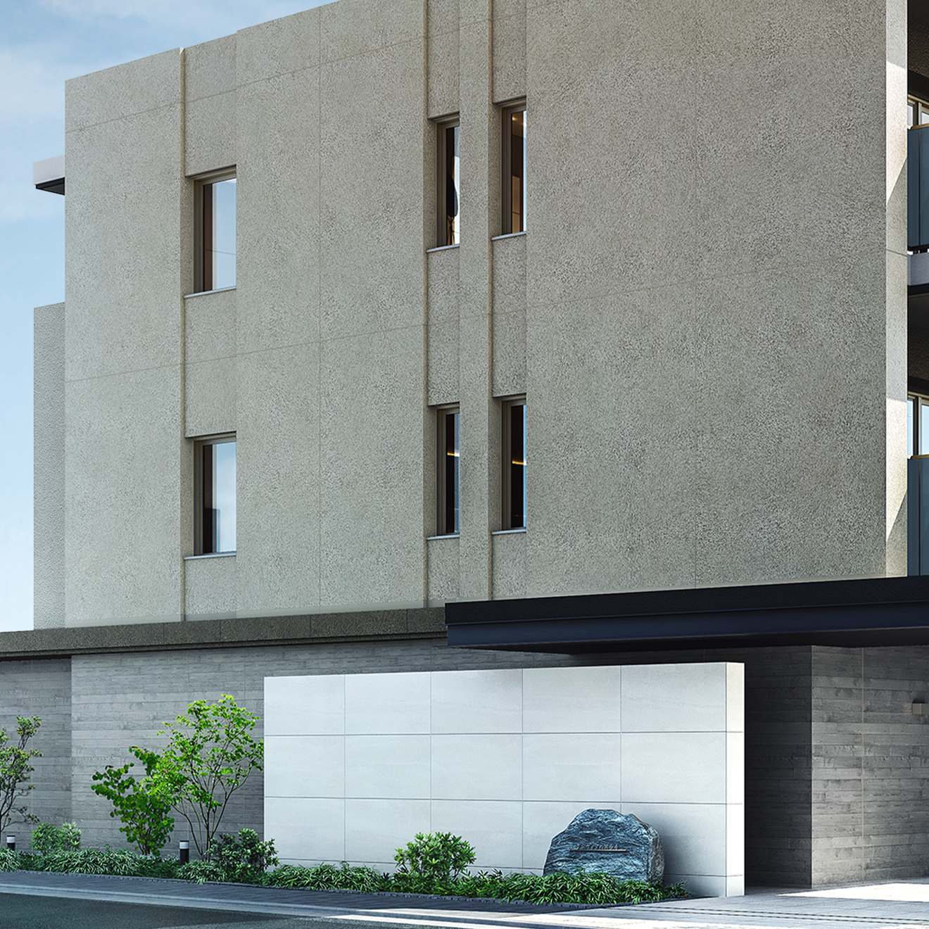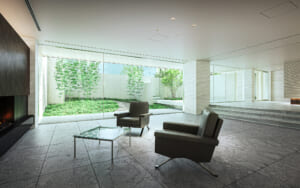 入り口が外から見えづらいのがいいですね!白いタイルに囲われて、まるで要塞のようです。入り口左側には石の館銘板が設置されていますね。自然と調和したレジデンスであることを象徴しており、重厚感があってかっこいいです…!シンプルながらもモノトーンに統一され洗練されたラウンジです!大きな窓から坪庭の植栽が見え安らぎを感じられるデザインです。