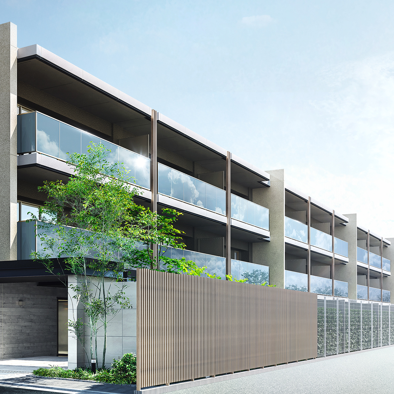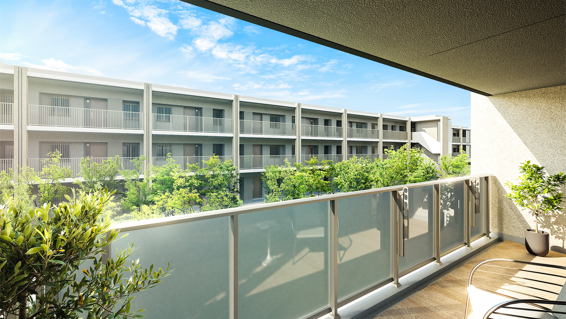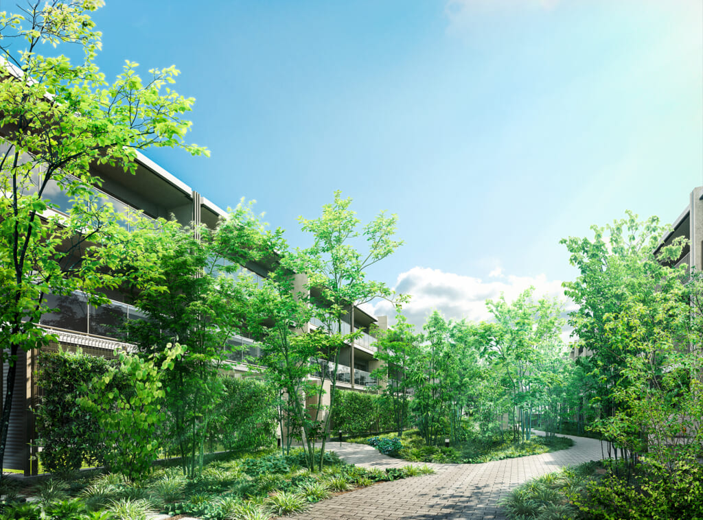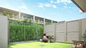 今回、1階住戸は全て専用庭が設けられています。フォレストコート側の1階からは、フォレストガーデンの緑が見え、より自然溢れる景色が広がりますね!目隠しには植栽が使用されています。無機質なフェンスだけでないところも推しポイントです!