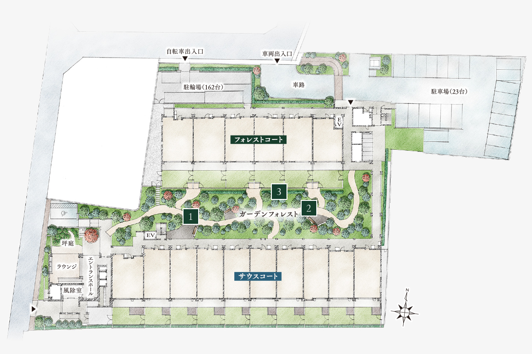 フォレストコート側の方はメインエントランスからの導線が遠く、敷地北側のサブエントランスを利用できるようになっています。また、車利用時にもサブエントランスを利用して出入りすると便利ですね!