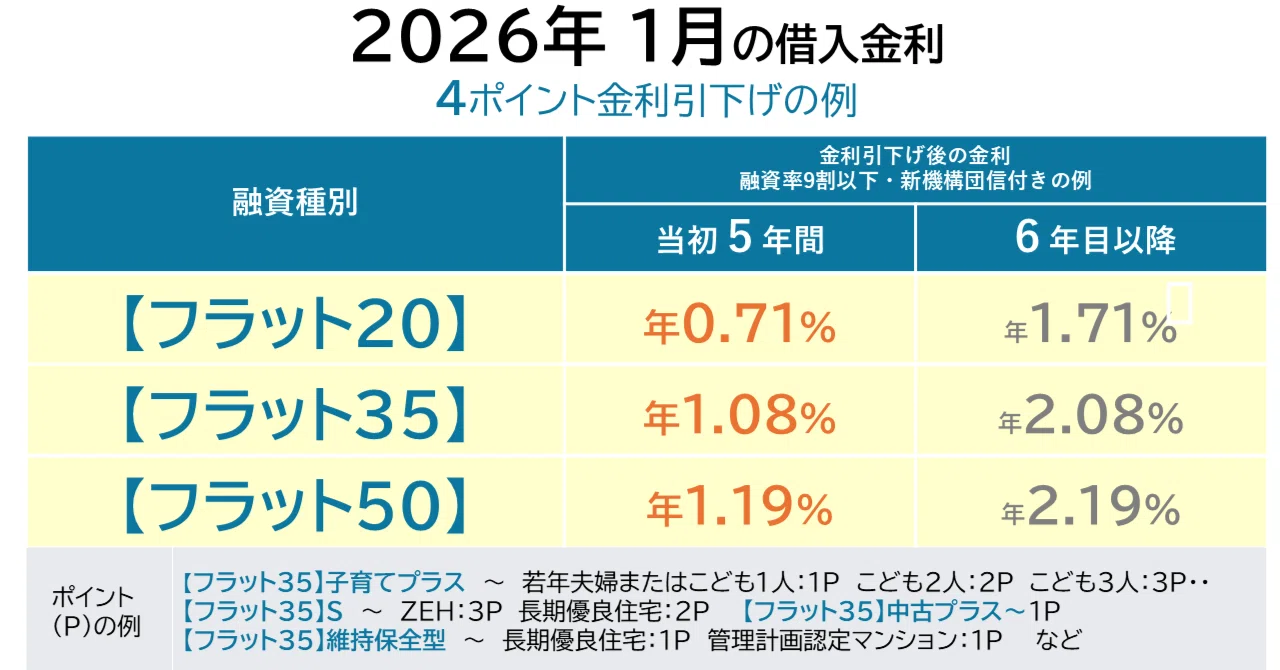 2026年2月時点、モゲチェック経由の特別金利は年0.48%(期間限定)。通常のネット銀行でも0.6〜0.8%台が主流です。一方フラット35は2.26%。変動と固定の金利差は約1.5%に拡大しています。銀行間の金利競争は今なお激しいです。各行は「引き下げ幅」を拡大することで、基準金利が上がっても適用金利の上昇を抑えています。特にネット銀行は新規顧客獲得のために積極的な金利優遇を継続しており、「政策金利の上昇ほどには、実際の適用金利は上がっていない」というのが実態なんですよね。