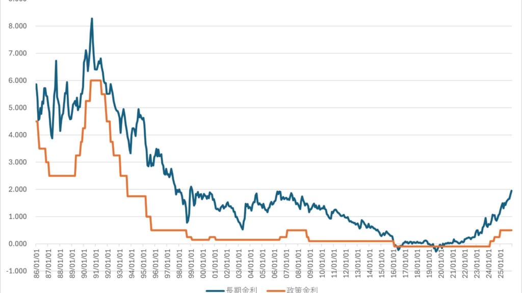 日銀は「経済・物価の見通しが実現すれば、引き続き政策金利を引き上げる」と明言しています。ESPフォーキャスト調査(エコノミスト約40名の中央値)では、2026年12月末までに政策金利は約1.1%まで上昇すると予測。楽天証券の長内氏は年2回ペースで2026年度に1.25%、2027年度に1.5%を基本シナリオとしています。