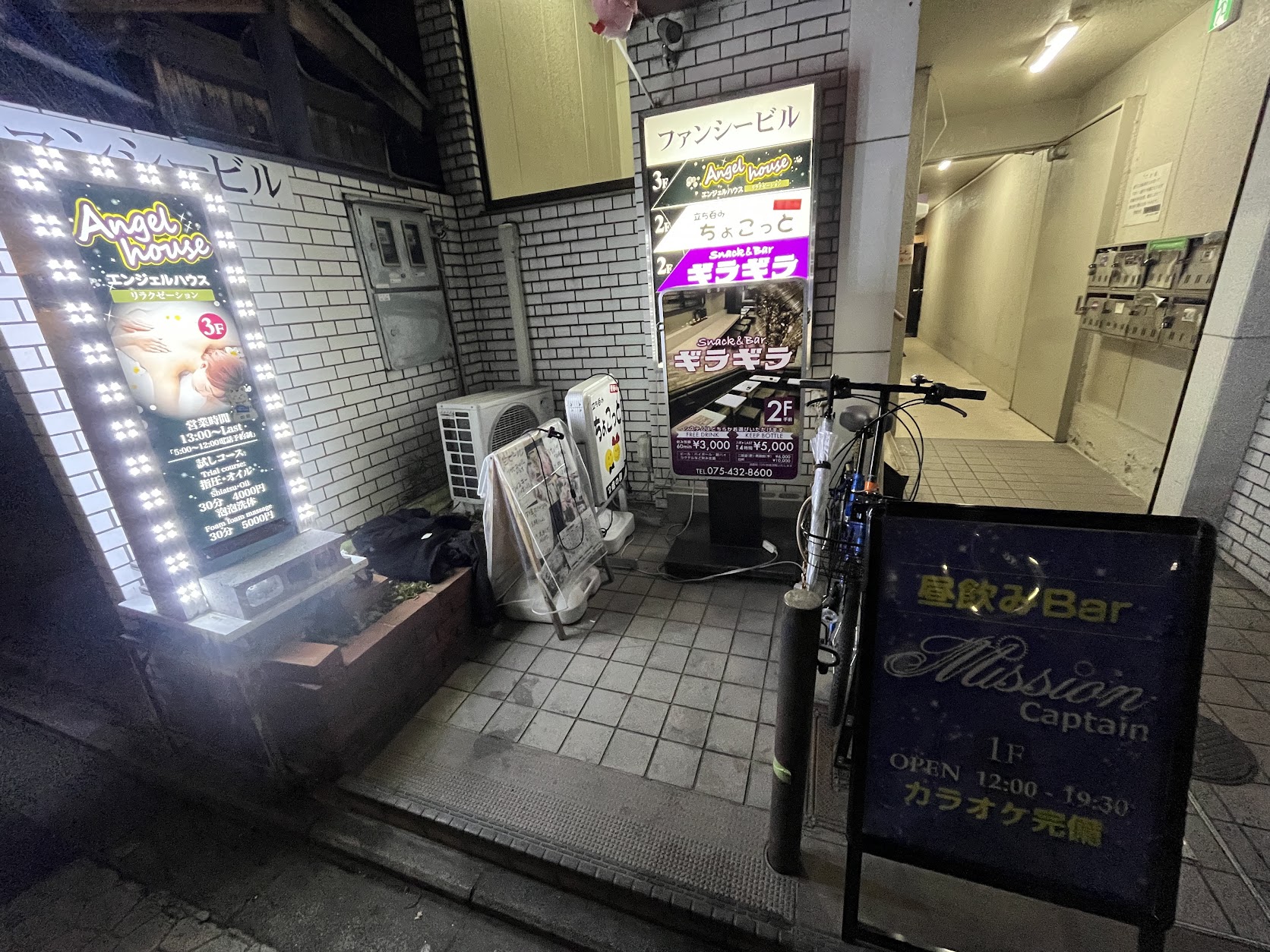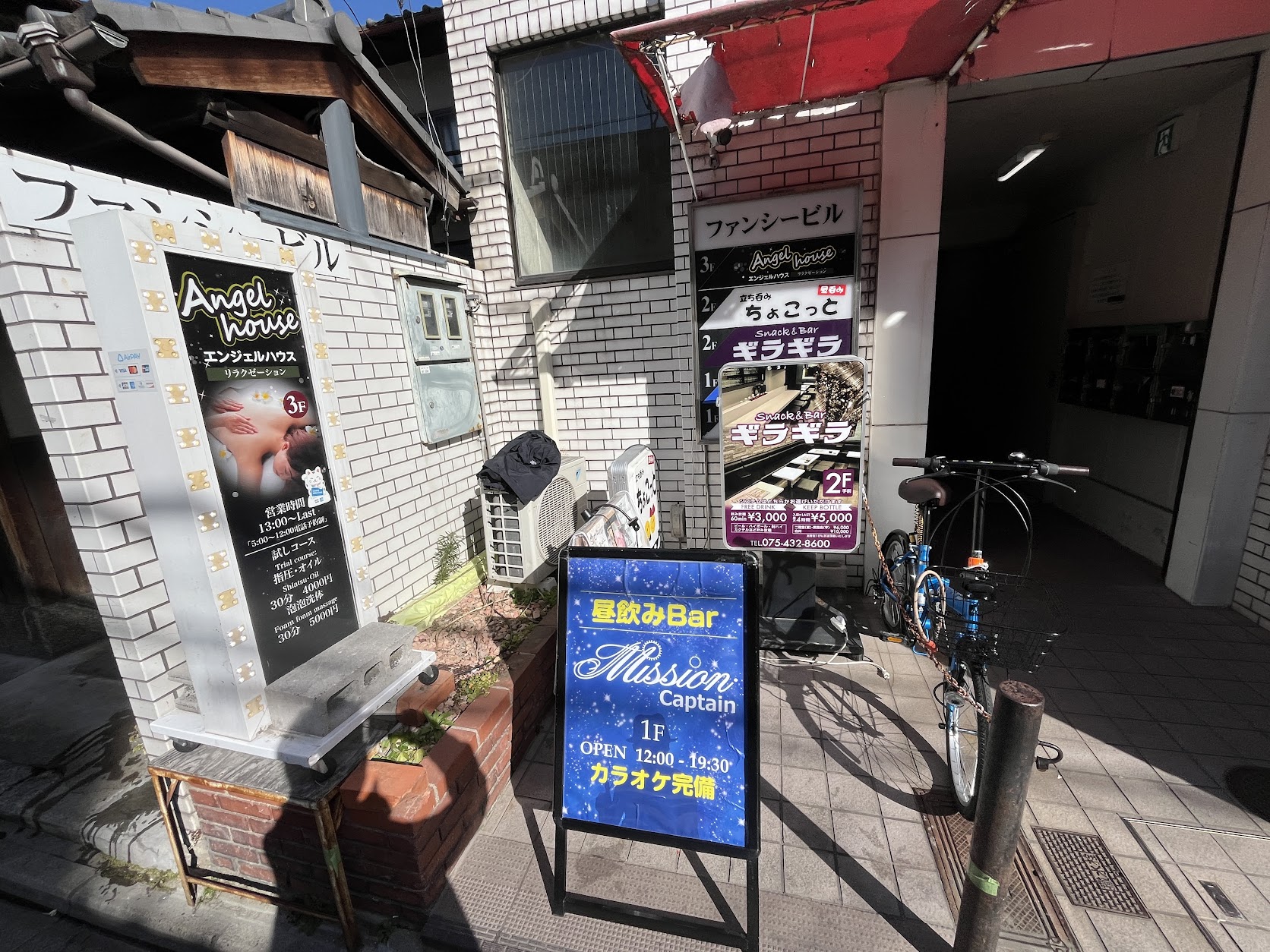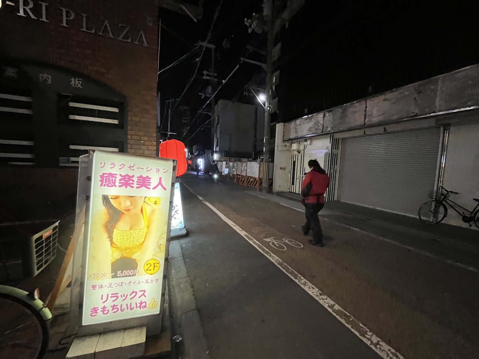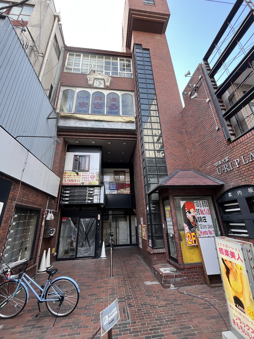 「四条大宮ユーリプラザ ビル」。長らく1階が閉まったままで廃墟感が漂うこの雰囲気が謎ビル感を醸し出しています。このビルには一際輝く「リラクゼーション癒楽美人」の看板が