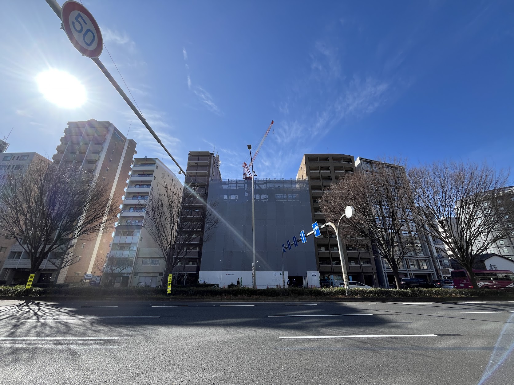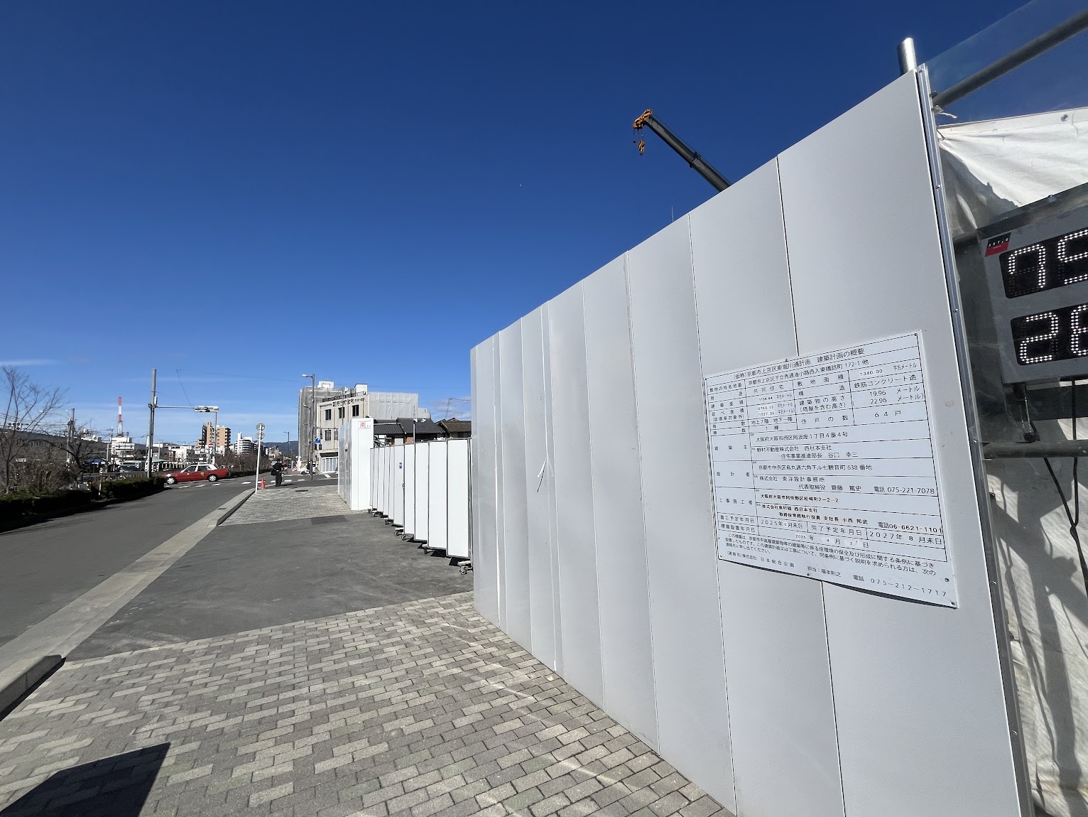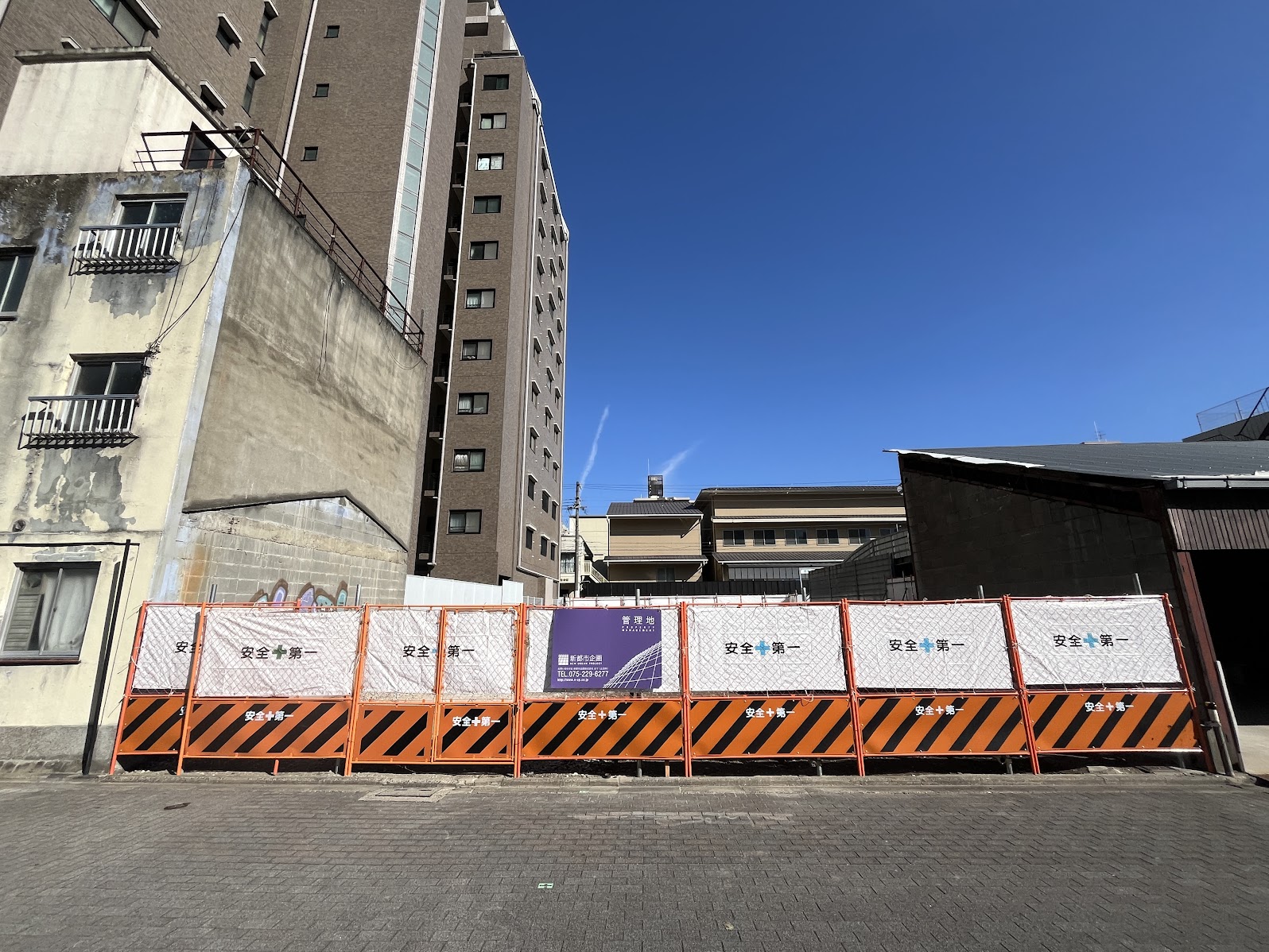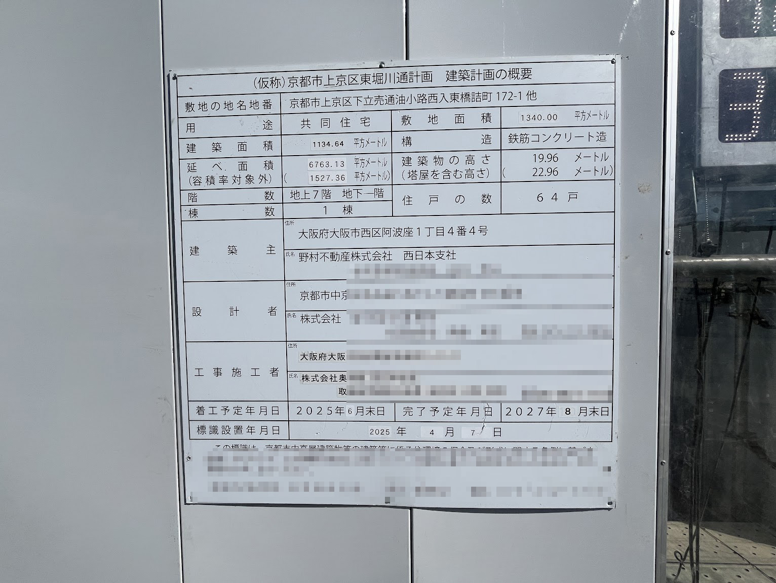 分譲当時の写真ですが(2022年7月撮影)、『レ・ジェイド京都堀川』(2023年3月竣工)。ここは元々ホテル計画の標識が設置されていましたがコロナで頓挫し、分譲マンション計画になりました。