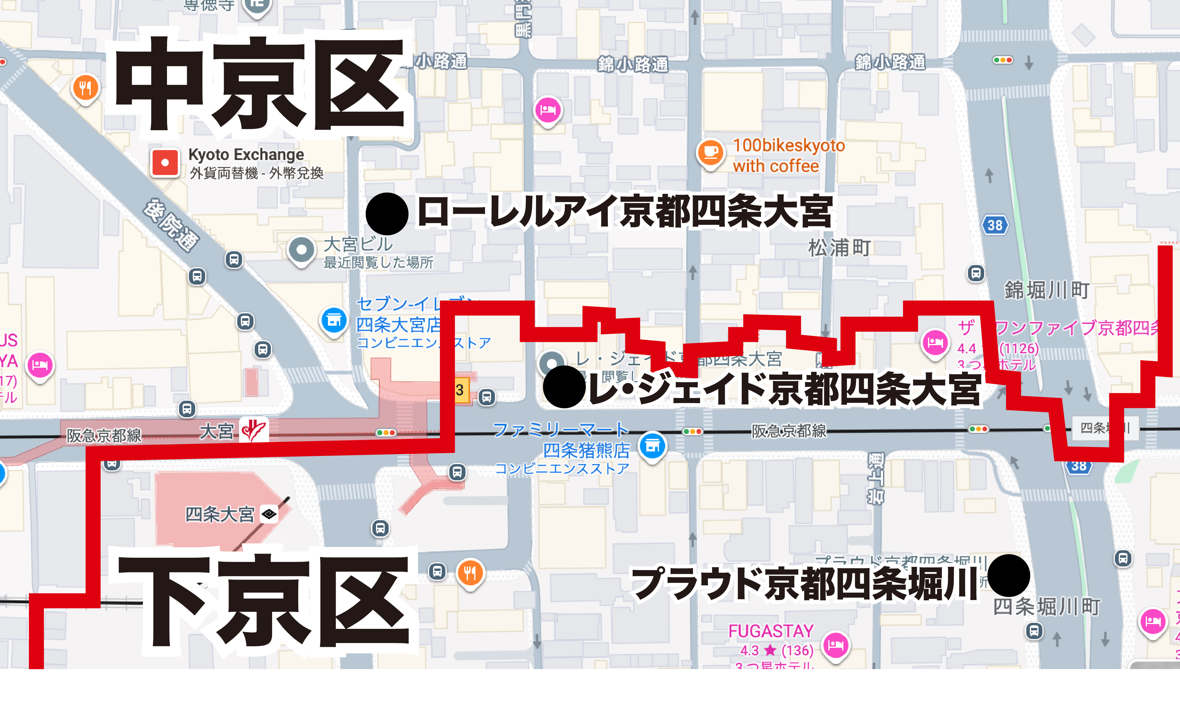 ただ「レ・ジェイド京都四条大宮」のアドレスは下京区でありましたが、今回の『ローレルアイ京都四条大宮』のアドレスは中京区