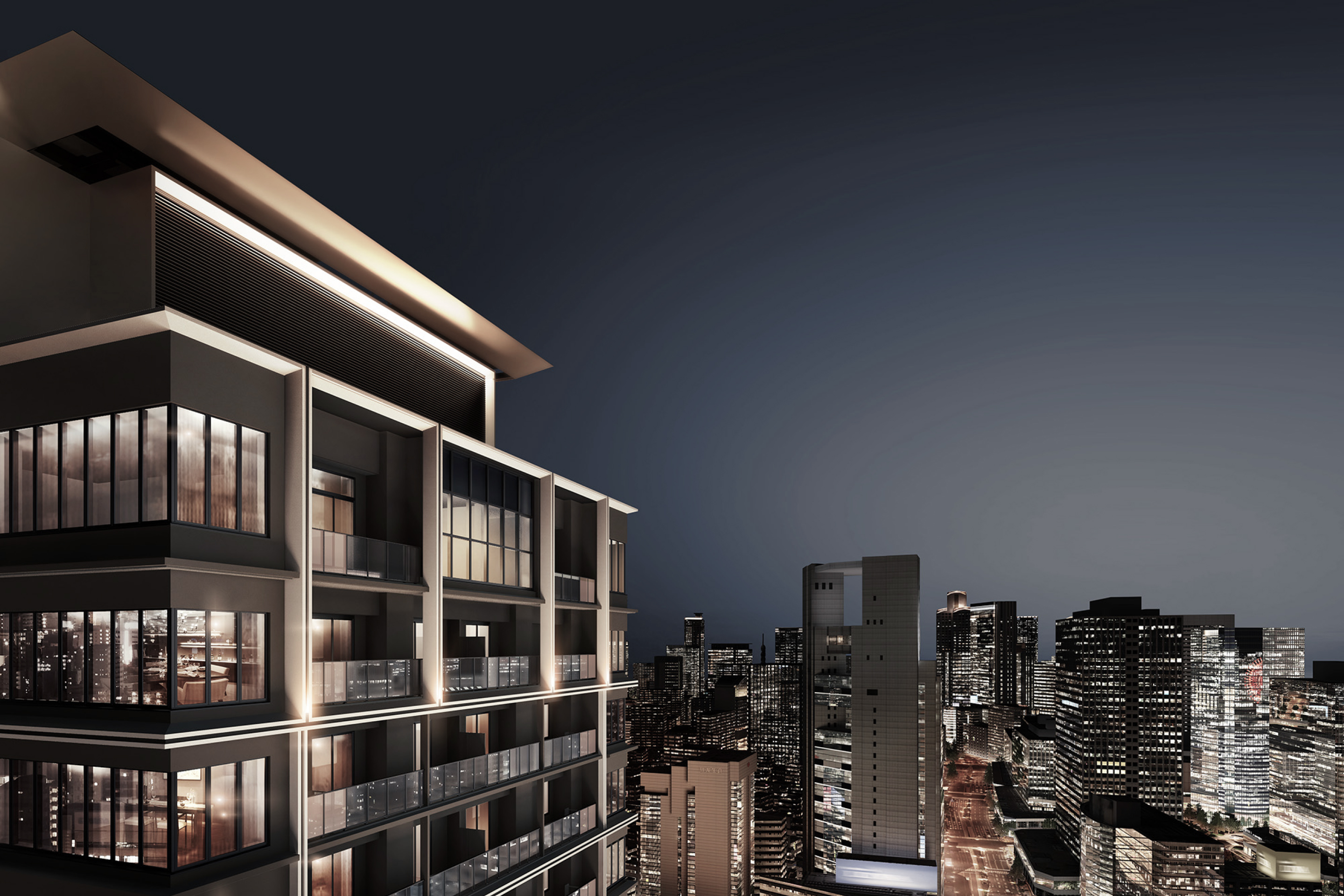 角部屋の方角によりますが、コーナーサッシは多いところで9面ありますので、高層階角部屋からの眺望は素晴らしいでしょうし、外から見てもガラス面が多いことで迫力あるデザインになっています。