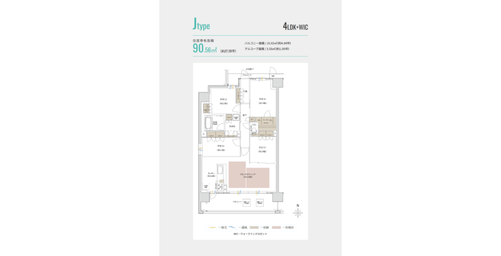 ■ 全体印象:90.56m²の4LDKは、最近のマンションとしてはかなり頑張ったサイズです。首都圏では70m²台で3LDKが普通ですが、関西・滋賀では面積的に余裕があるのが嬉しい。4LDK+WIC+SICという構成は、充実した収納を確保しながら居室も確保する意欲的なプランです。