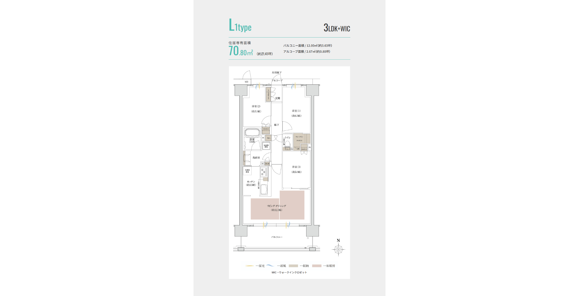 【タイプL1】3LDK+WIC|専有面積:70.8m²