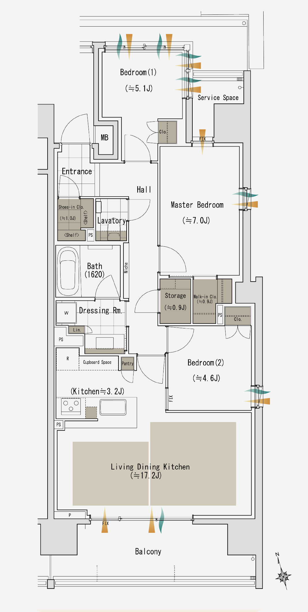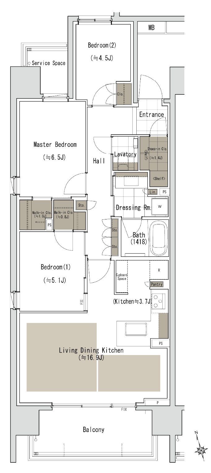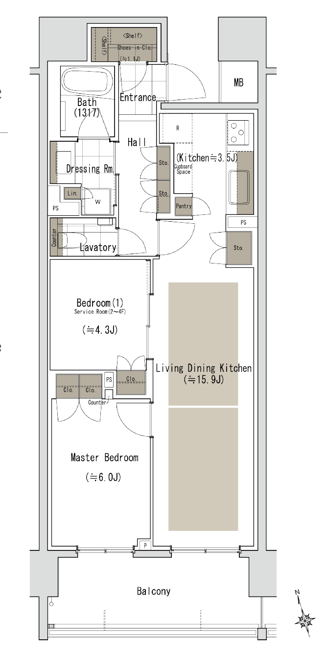 こちらは2LDKの間取りで、2~4階については採光要件を満たしていないため1LDK+Sとなっています。将来的に住み替えを検討されている方は基本的には5階以上の2LDKを選ばれることをおすすめします。(リセールとなると検索条件によって出てこなくなったりするため)