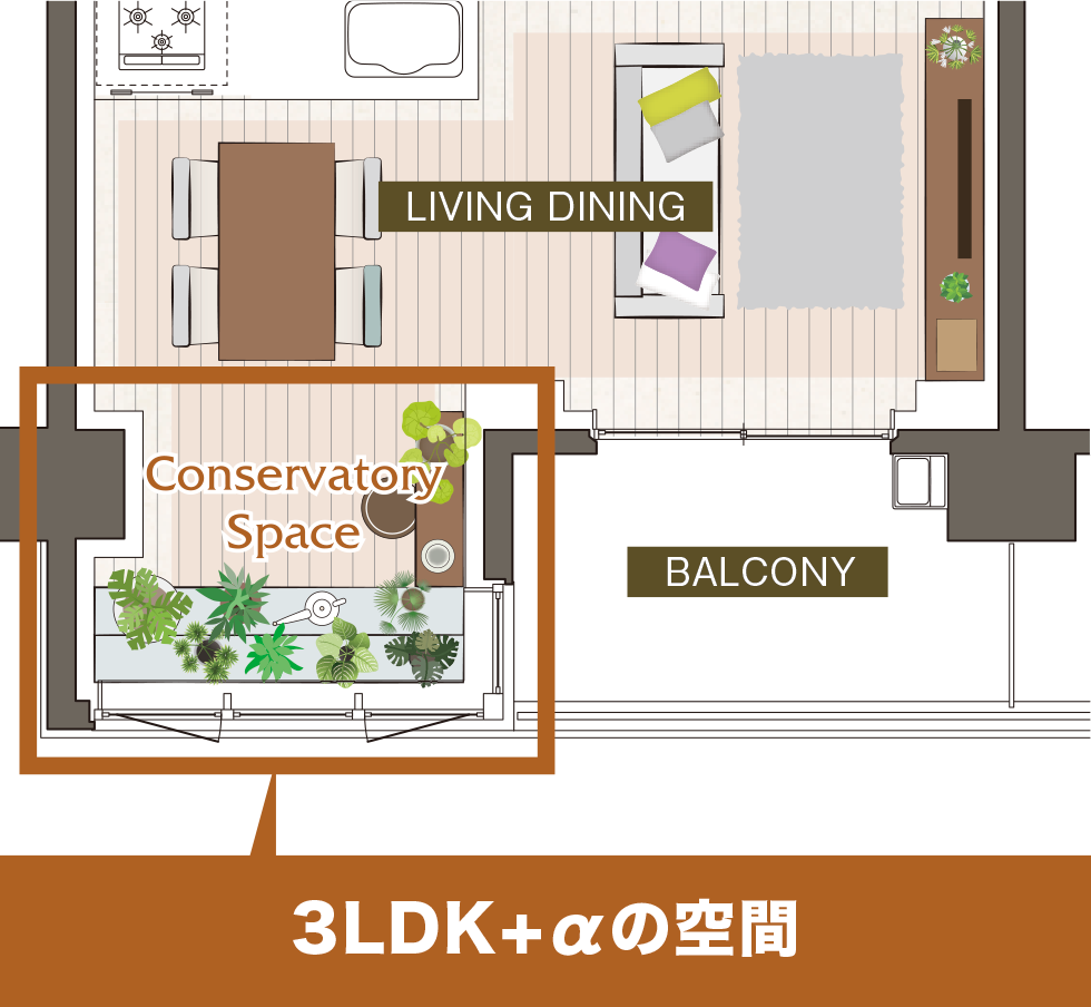 2面ガラスに囲まれたコンサバトリースペースというのを一部住戸に用意してくれています。趣味スペースになったり、ペットのためのスペース、赤ちゃんの遊び場、洗濯物を干すスペースなど、自由な使い方ができるこのちょっとした空間、ありそうで無かった良いプランですよね。
