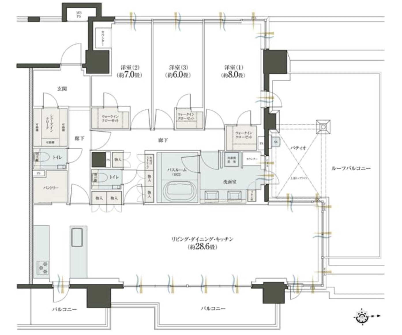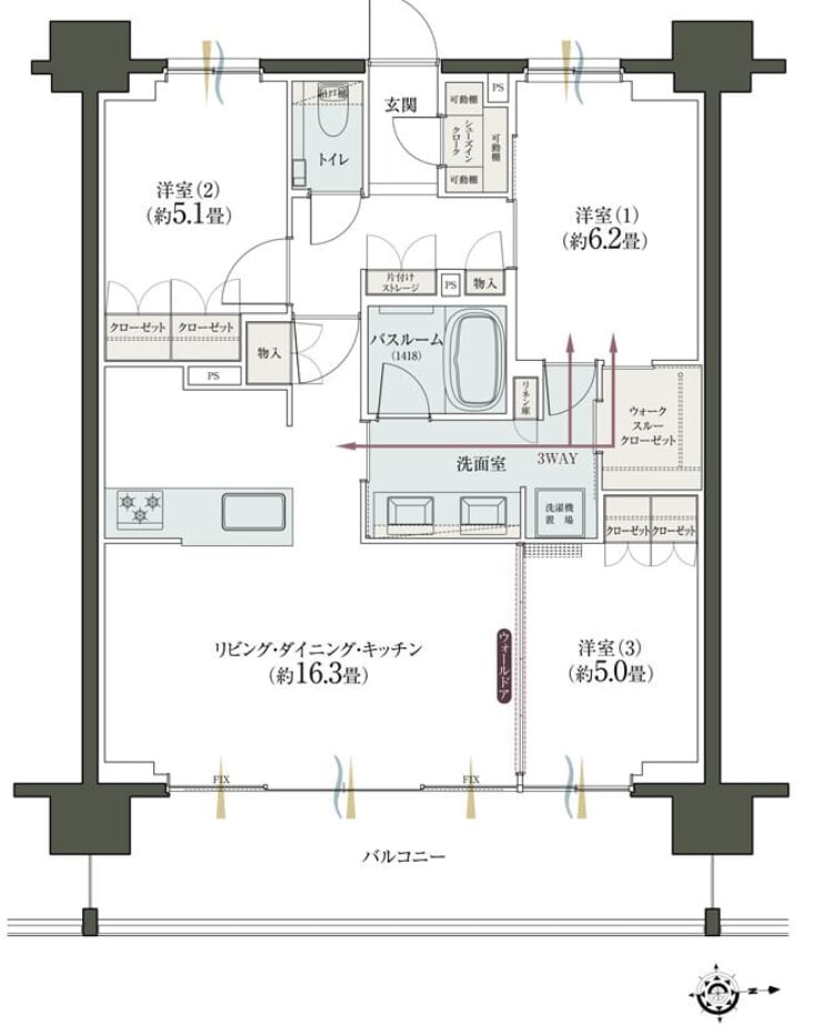 この間取りほんといいですね…!特に注目すべき点として、①ワイドスパンでLDKが16.3畳と広々しています。洋室と繋げたらさらに開口部も広くなり良いですね〜。②専有部の面積に対して珍しく、洗面2ボウルです!③洗面室からLDK、洋室、ウォークインクローゼットへと3wayの行き来ができるようになっています。