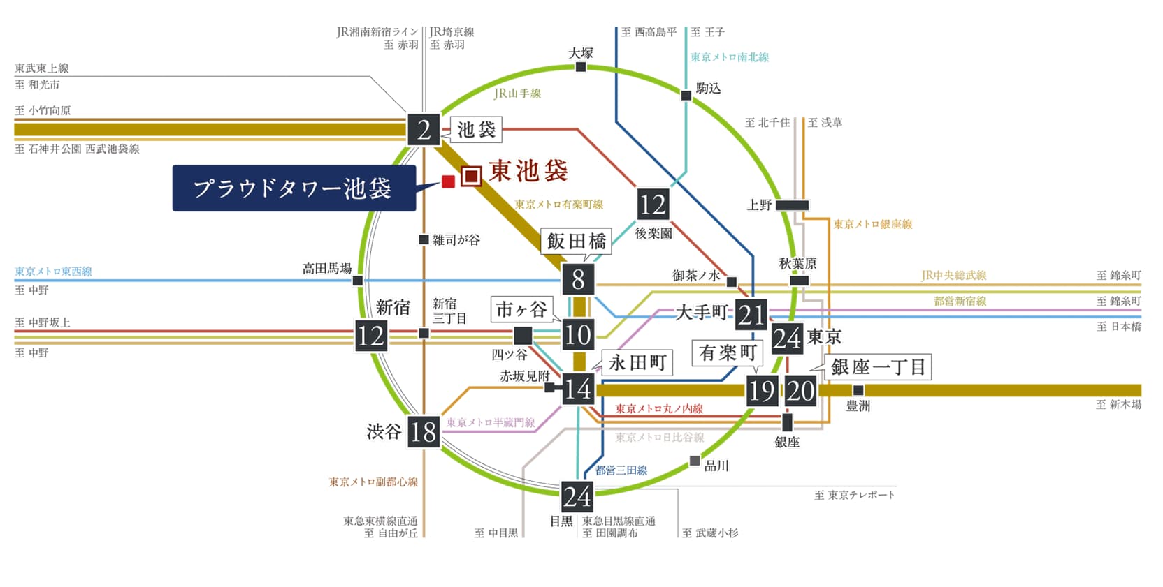 ターミナル駅である「池袋」駅から「新宿」駅まで5分、「渋谷」駅まで10分、「大手町」駅まで15分、「東京」駅まで17分。いずれも直通です。都内の主要路線へのアクセスが良く、直通、または乗り換え1回で多くの駅にアクセス可能です。