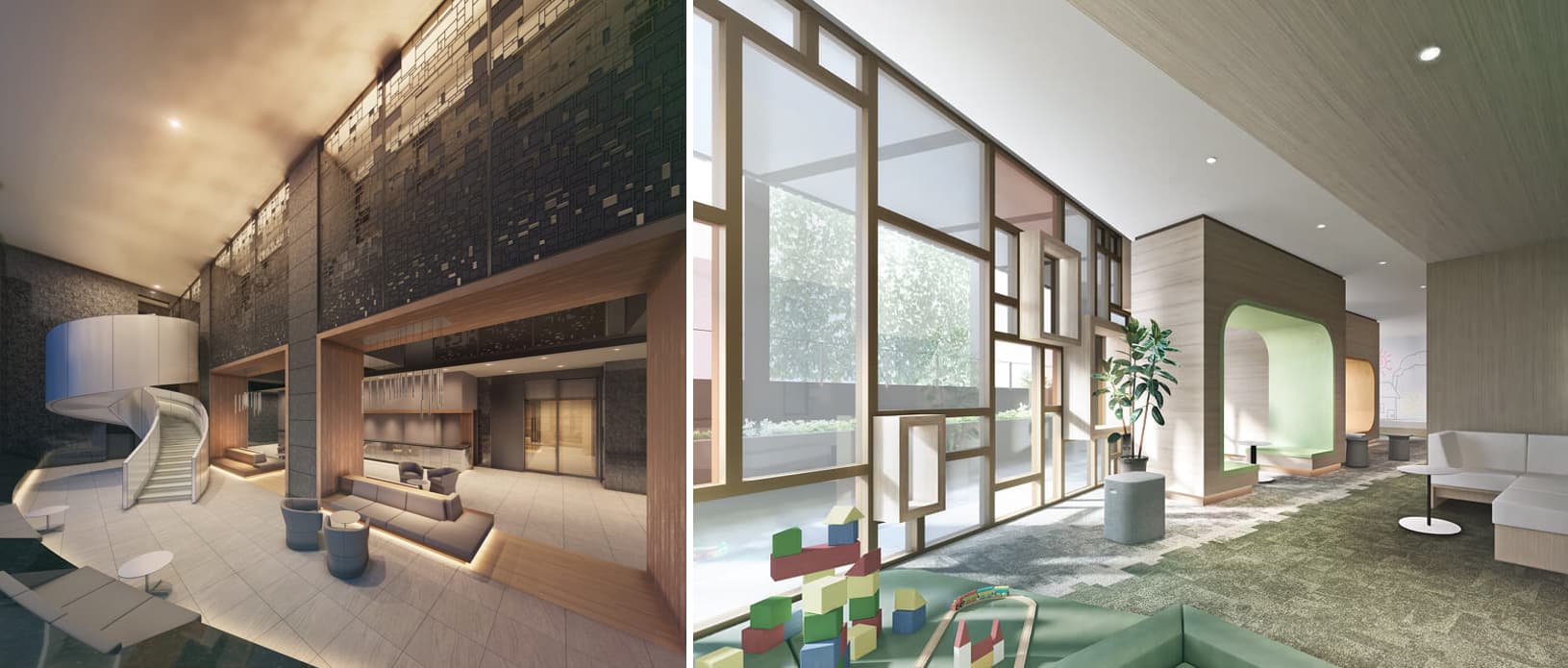 2階にはフィットネスラウンジ、複数人可能のワークスペースとなるコラボレーションラウンジ、子育て世帯交流スペースとなるコミュニケーションラウンジ、スイートラウンジ。