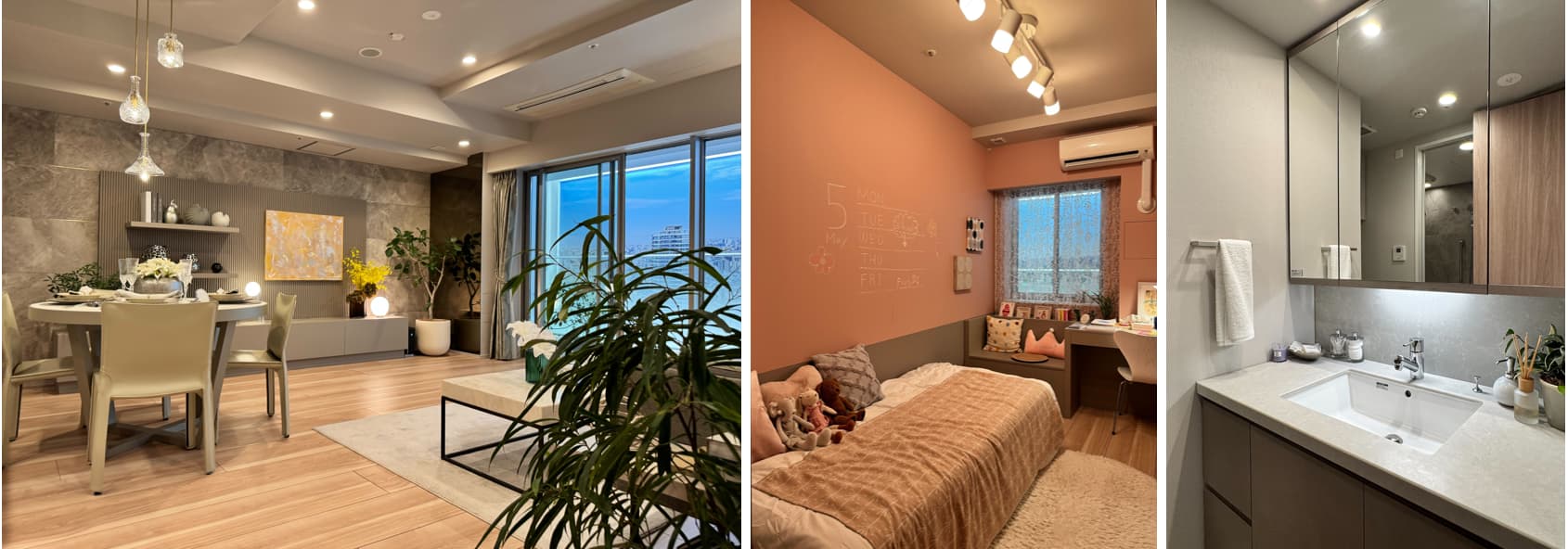 玄関は電子錠、天板はフィオレストーンでキッチンカウンターのサイドもフィオレストーンが貼りおろしされています。ディスポーザー、洗面所もフィオレストーン天板、浴室はミストサウナ付きで、日ポリ化工。なによりもいいと思ったのは、リビングに食わせて、洋室1も床暖房が入ることとリビングのエアコンが天井カセット型エアコンであること。我が家は寒い冬もほぼ床暖房のみで乗り切る家なので、洋室に床暖房があるのはいいです。特に温度差が身体によくない高齢者やほこりや乾燥が気になる未就学児のいるご家庭には床暖房生活を強くお勧めしたい!