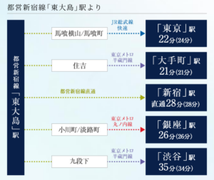 上記図の所要時間は駅to駅なので、「ザ・パークハウス亀戸九丁目」からであれば、+11分となります。所要時間・本数を考慮すると、「大手町勤務」の人に向いた立地です。