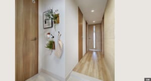- ちょっと惜しい所もあります。玄関にアルコーブが一切ありません。Gタイプは端から2番目の住戸なので人通りは多くないと思いますが、玄関を開ける際は通行人とぶつからないよう注意が必要です。また洋室1・3ではアルコーブがある物件より近くに人が通っていることを感じやすいかもしれません。