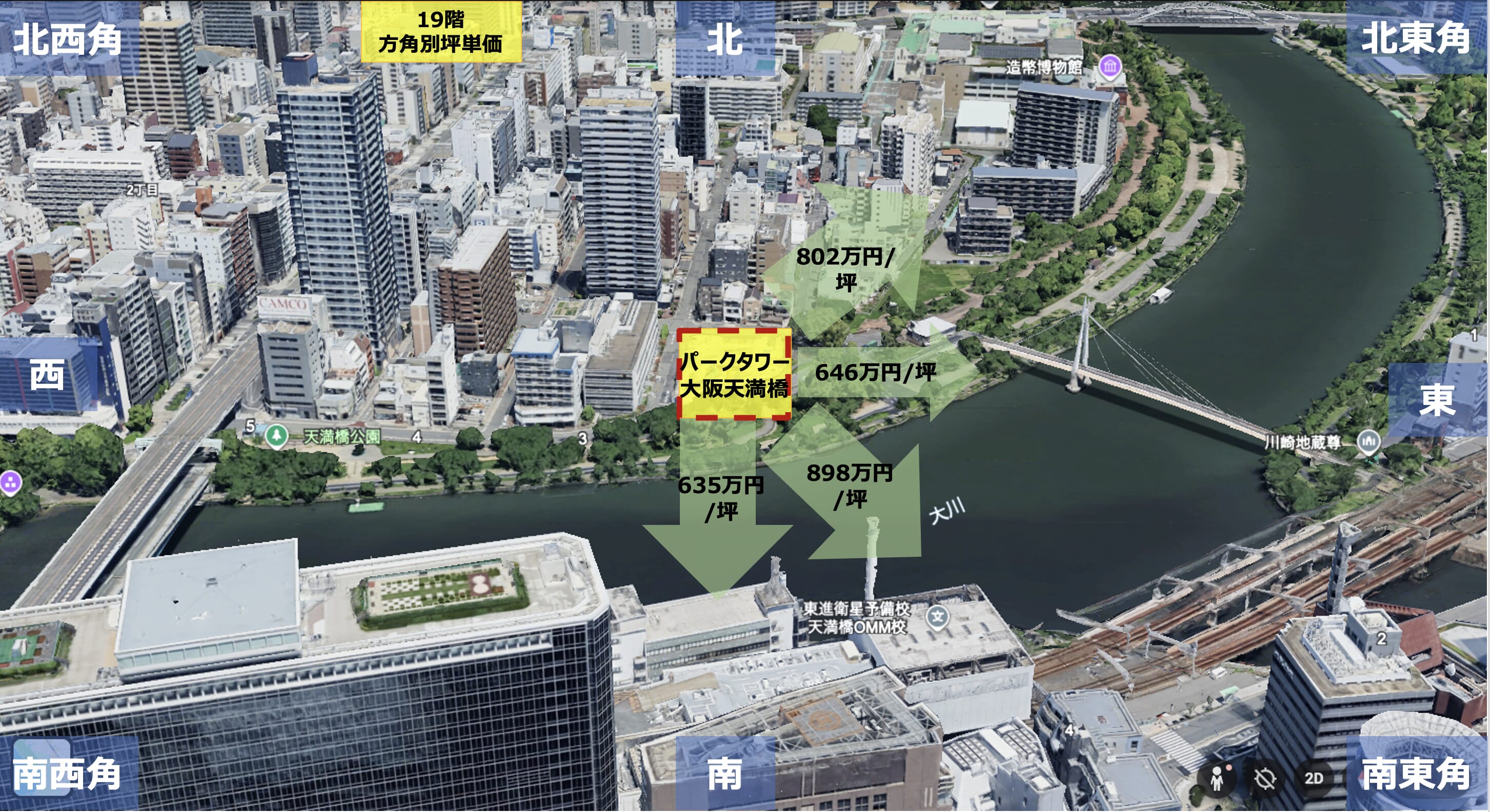 北西角の中之島・梅田viewと北東角の大阪城viewで値段が異なり、階層は北東角の方が低くても坪単価ベースでは坪40万円以上の価格差が生まれておりますので明確に眺望による価格差が中古物件でも出ております。
