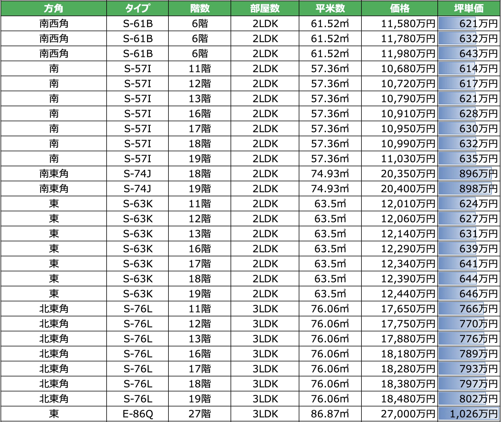 角部屋は南西角も1期では販売対象となっているものの、販売対象住戸は低層階になるため下の図には入れておりませんが、北東角と南東角で見ると坪単価差は約100万円/坪、中住戸と角部屋の比較だと坪150万円以上角部屋が高くなります。