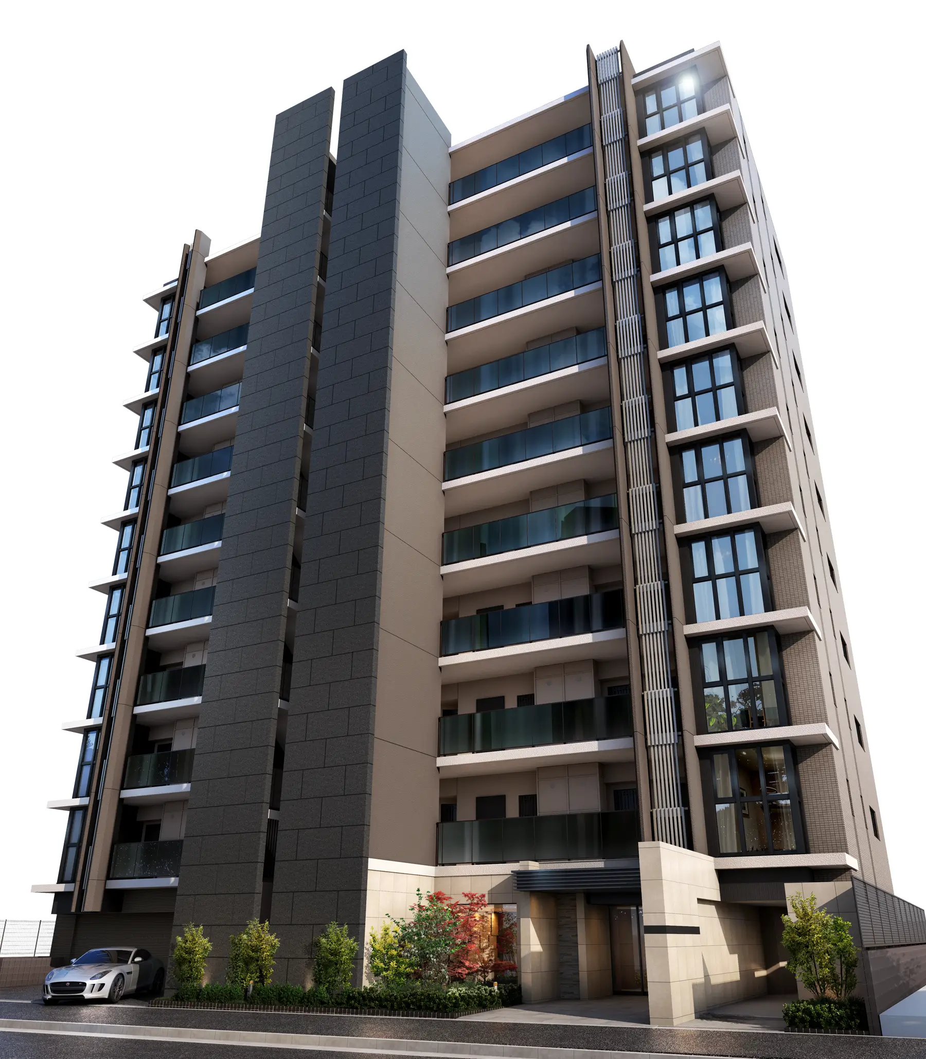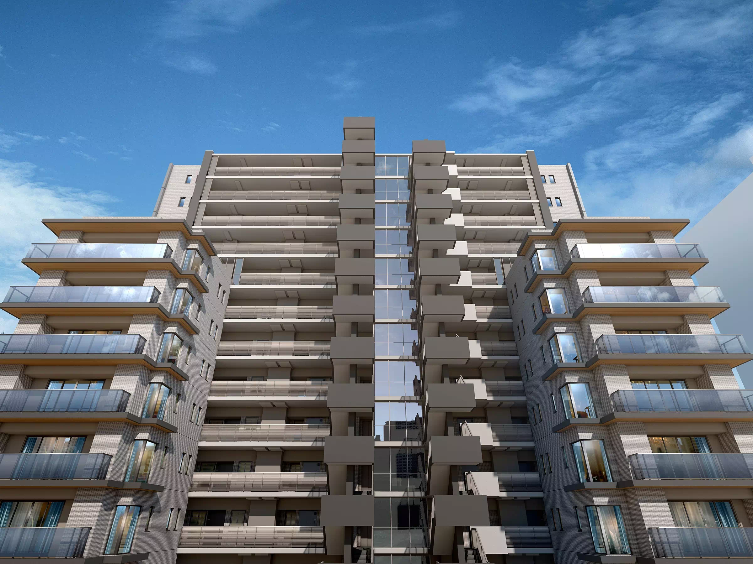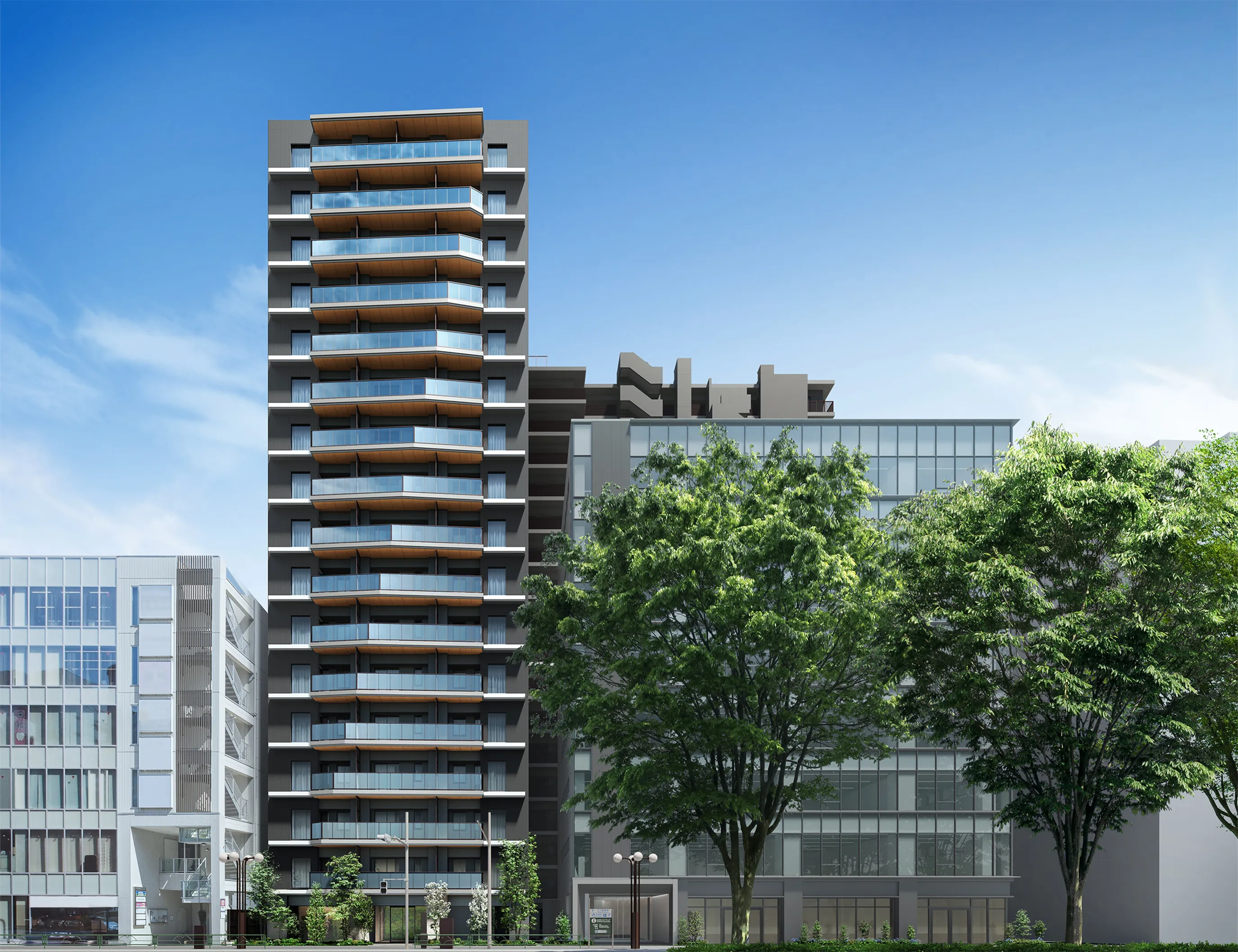 外観デザイン本件は住宅棟とオフィス・商業棟の2棟構成です。オフィス・商業棟と並び一体感のあるデザインとなるよう、バルコニーは全面ガラス手摺が採用され、カラーテイストも同系色です。