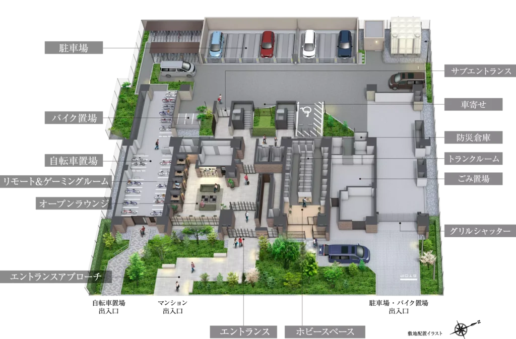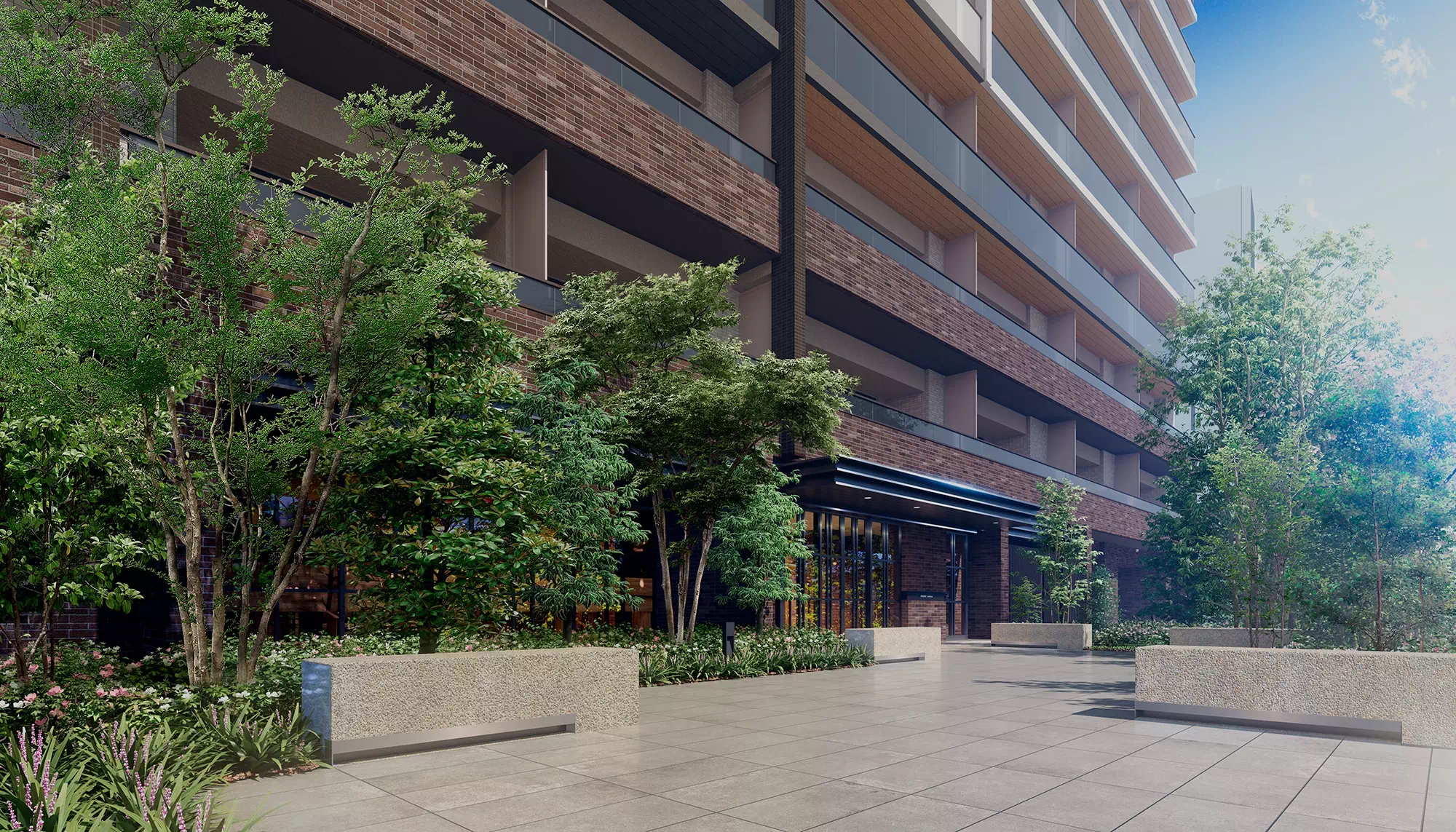▼エントランスアプローチです。前面道路からセットバックによって生み出された広いアプローチ部分は植栽によりバルコニーからの景色に緑を添えるほか、離隔距離の確保にも繋がっています。緑の植栽とブラウンのタイルをあしらった外観は、周囲の建物と異なる温かみのある外観になりそうです!