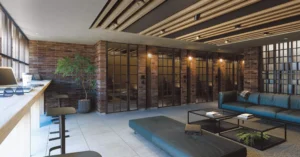 ▼共用部はオープンラウンジ、リモート&ゲーミングルーム及びホビースペースが設けられています。外壁タイルと統一感を意識したデザインで、リモート&ゲーミングルームの格子状の扉や街灯をイメージした照明、ウォールアートなど遊び心を感じられます。