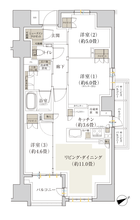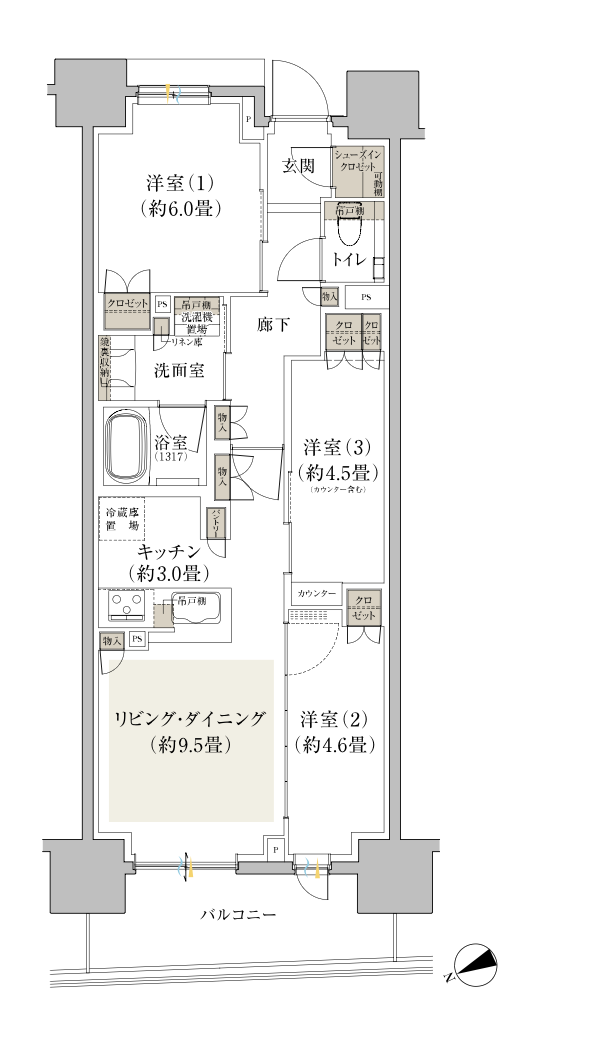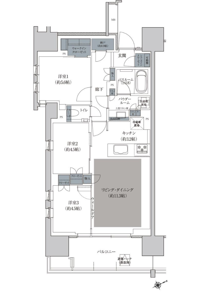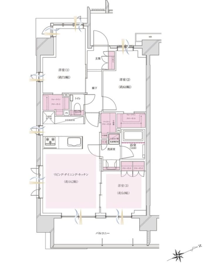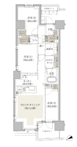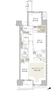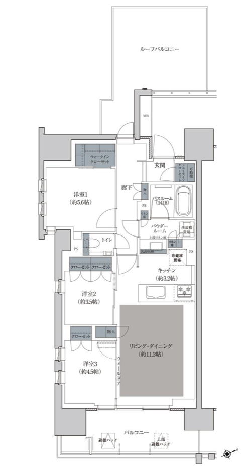 3LDK 71.43㎡ 南東向きルーフバルコニー付11階
