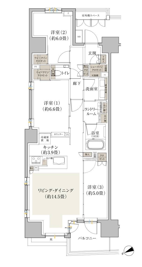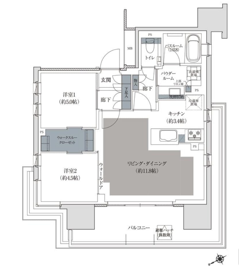 2LDK 58.39㎡ 北西向き 角住戸7階