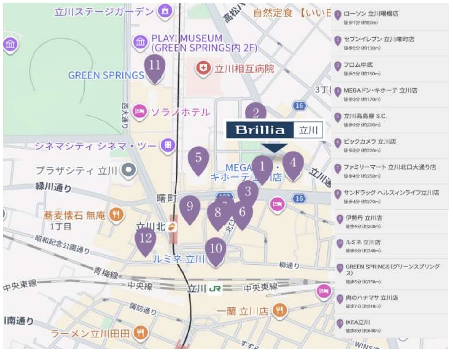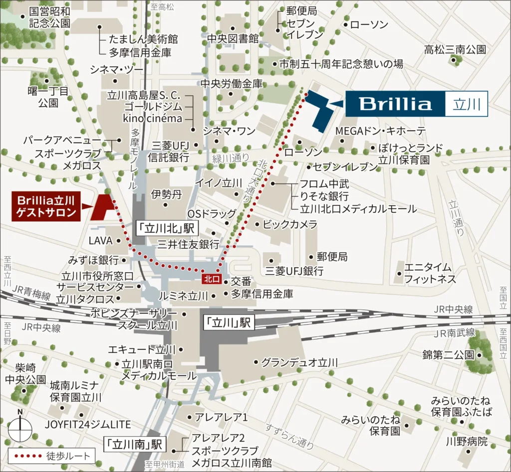 それぞれ個性や役割の異なる商業施設がギュッと集まっているのが駅北側の良さです。もちろんGREEN SPRINGSをはじめとした立飛が開発したエリアや昭和記念公園公園も近く、これらを使いこなせる本件の立地がいかに特別かお分かりいただけるかと思います。