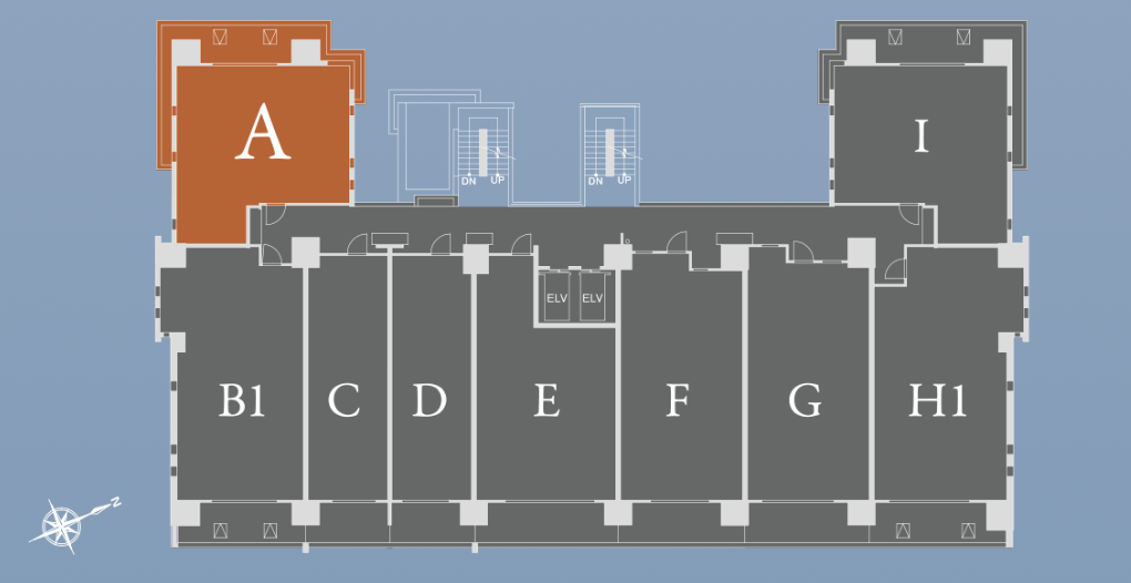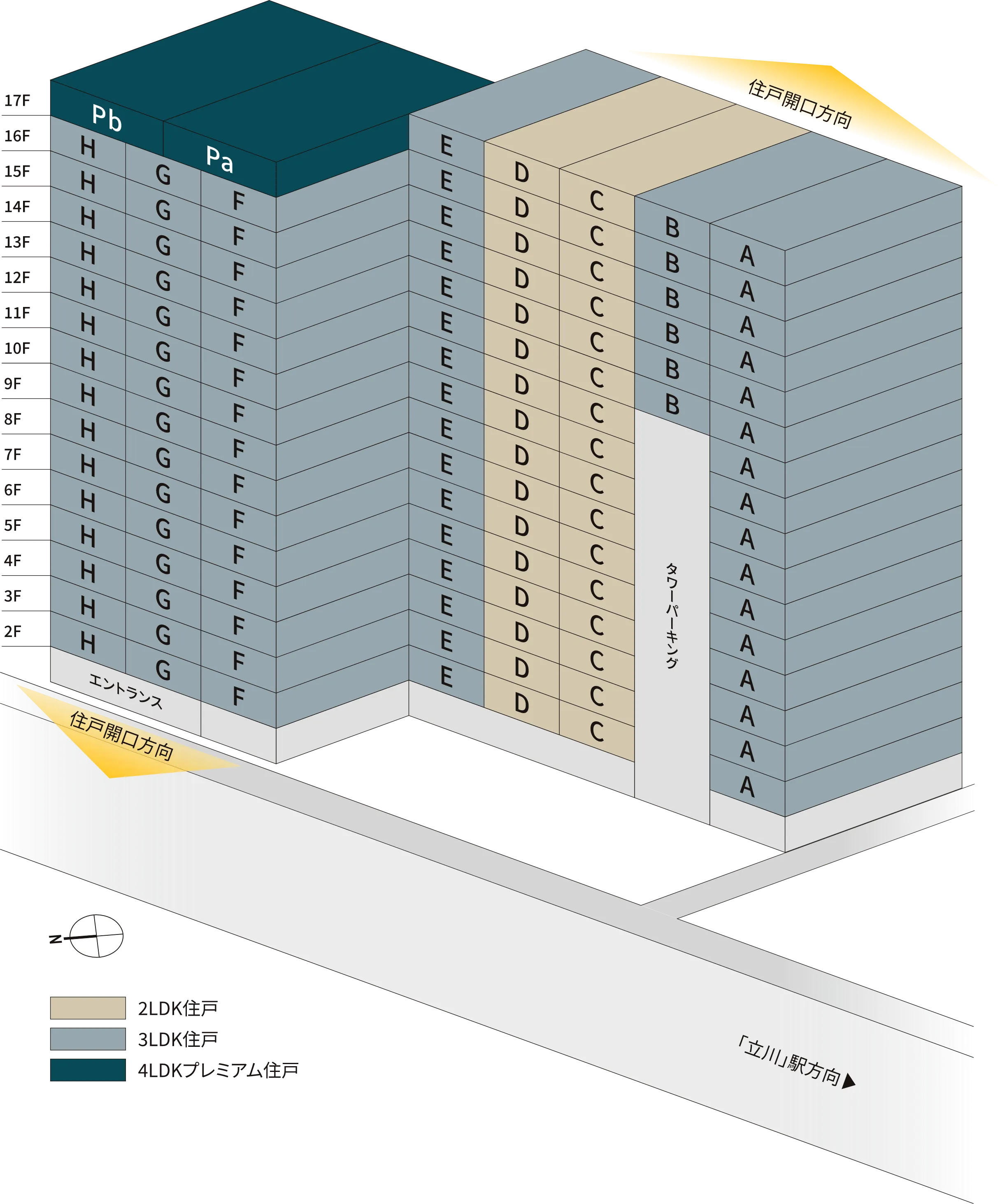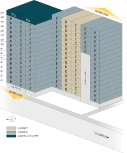 大通りから見えたのはH・G・Fタイプで北西を向いています。一方、E、D、C、B、Aタイプはオフィス・商業棟の裏側になり、バルコニーの向きは南東向きです。▼Gタイプ