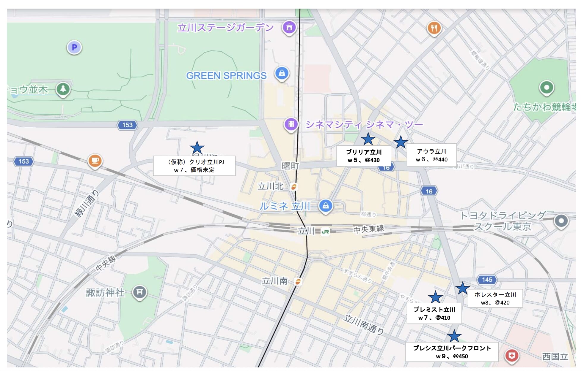 ▼立川の新築マンションプロット図はこちら(凡例:w7とは徒歩7分、@400とは坪単価400万)こう見ると、立川通りに供給が多くなっているのがわかりますね。価格帯としては坪410万〜450万といった相場感になっています。
